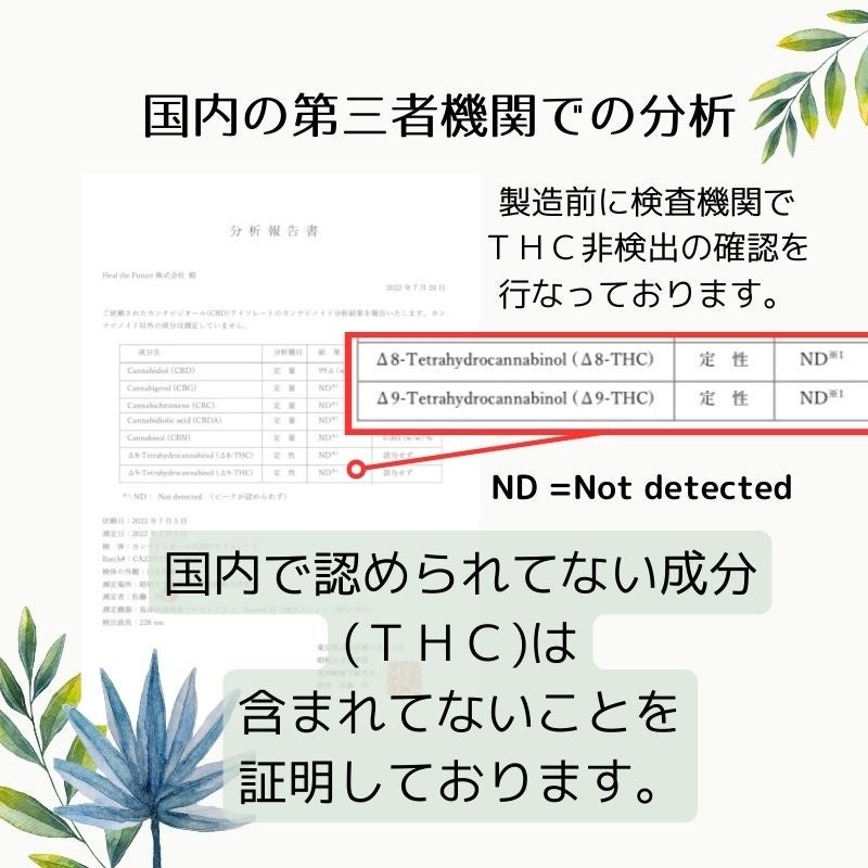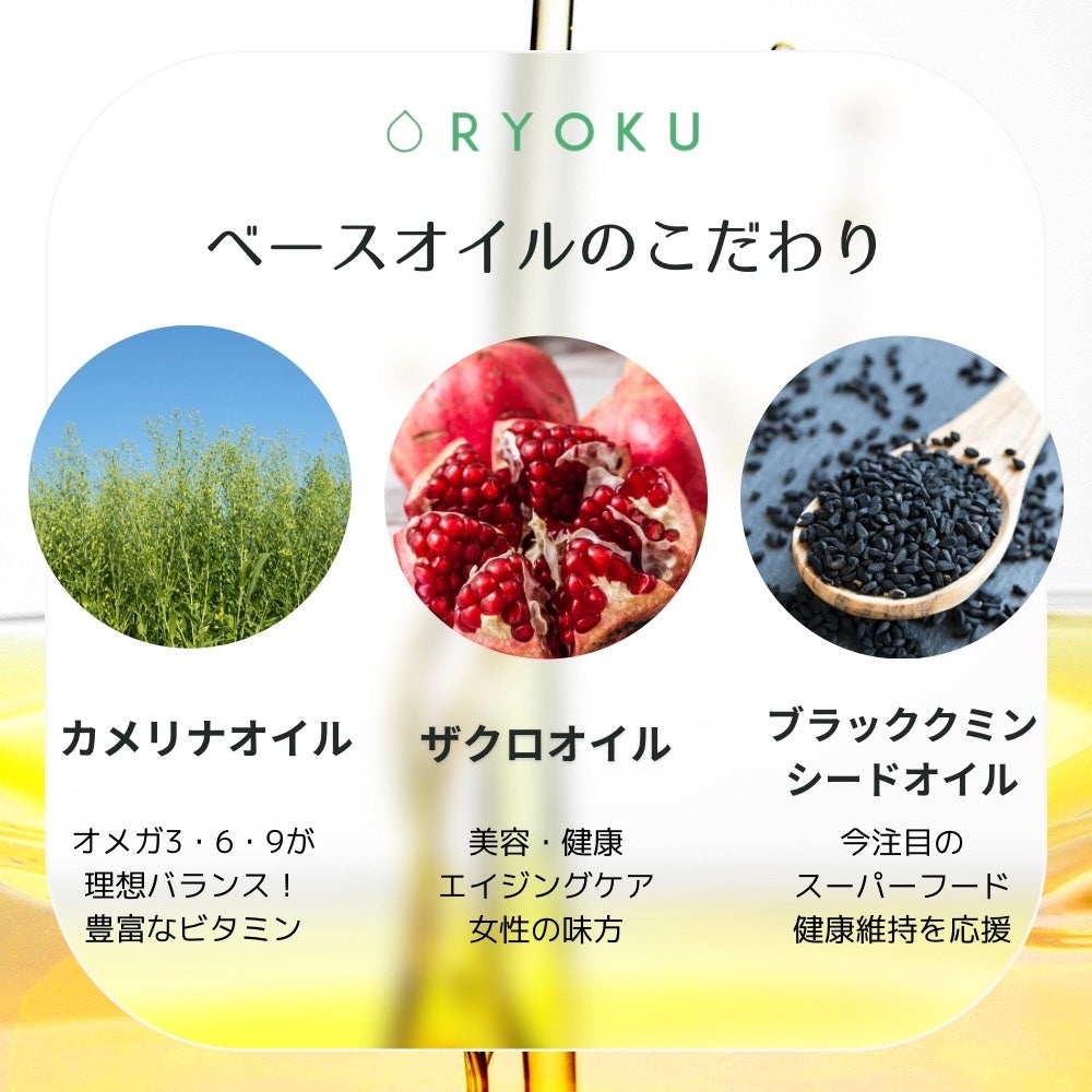 『RYOKU』の「CBD OIL」は、純度99%のCBDを使用した、CBD濃度10%のオイルです。ベースとなる油脂は、低温圧搾法(コールドプレス製法)を使用した、有機JAS認証カメリナオイル、ザクロオイル、ブラッククミンシードオイルをオリジナルブレンドしています。各原料の良さを生かしつつ、厳選された原料を使用し丁寧な製法で作られています。更にビタミンDとテルペン配合し、ふんわりとしたフルーティーの香りから、サラッとした飲みやすい味わいとなっています。