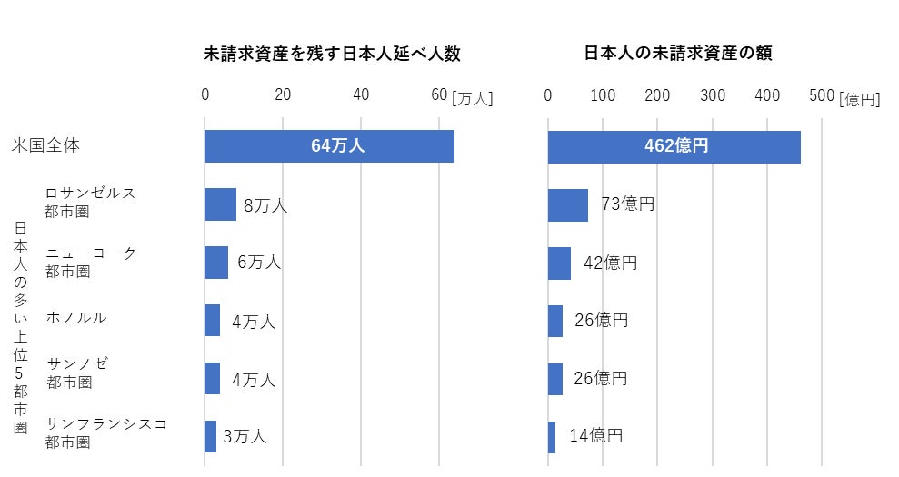また、米国全体での日本人の未請求資産の総額はおよそ462億円と推計されました。上にあげた5都市圏では、それぞれ、73億円、42億円、26億円、26億円、14億円になります。
