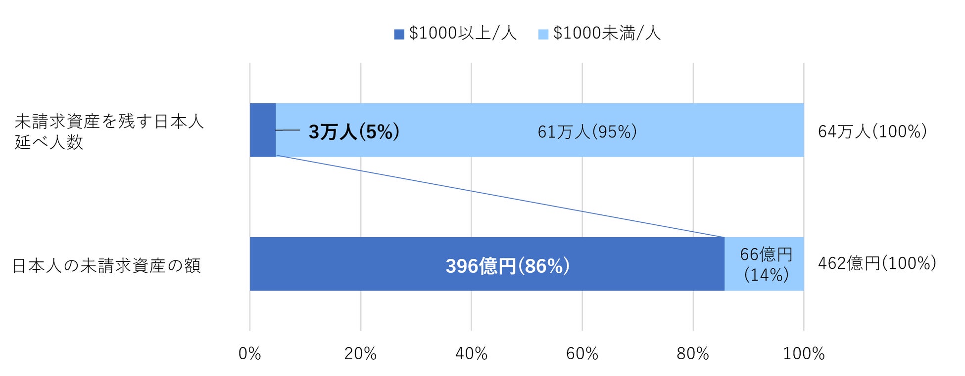 アメリカで日本人の残している未請求資産のうち、$1000以上の資産は、人数ベースでは約3万人(アメリカで未請求資産を残す日本人64万人の5%)であるのに対して、金額ベースでは396億円(アメリカの日本人の未請求資産総額462億円の86%)になります。