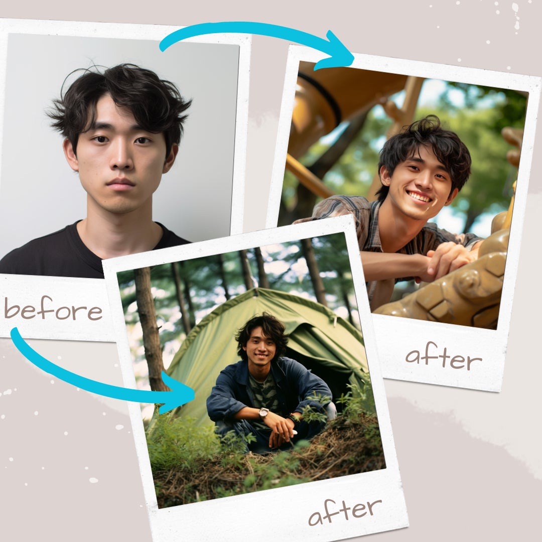 そのため、”桜の季節に着物を着て京都観光する私”や”オシャレなオフィスでスーツをかっこよく着こなす俺”といった現実的に撮影しづらい写真も簡単に生成できます。