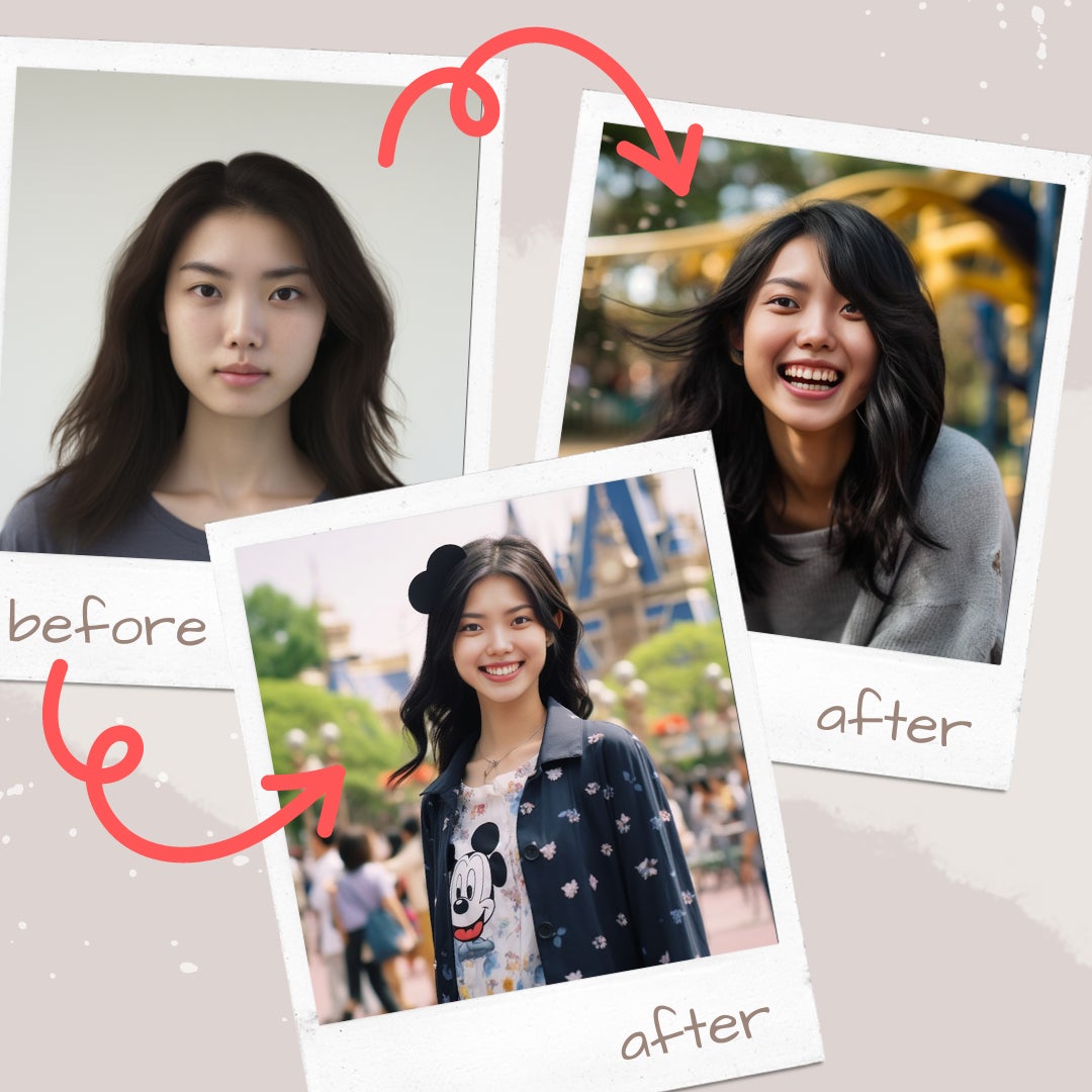 利用者は部屋から出ることなく、顔の自撮りを1枚送るだけで、公園やアミューズメントパーク、街中やオフィス等、様々な場所でプロカメラマンに撮影されたようなハイクオリティな画像を作成できます。
