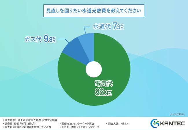そこで、「見直しを図りたい水道光熱費を教えてください」と質問したところ、『電気代(82.9%)』と回答した方が最も多く、次いで『ガス代(9.8%)』『水道代(7.3%)』となりました。