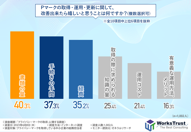 「Pマークの取得・運用・更新に関して、改善できたら嬉しいと思うことは何ですか?(複数選択可)」と質問したところ、『書類の量(40.3%)』と回答した方が最も多く、次いで『手続きの手間(37.3%)』『経費(35.2%)』『取得の際に求められる知識の量(25.4%)』『運用コスト(21.4%)』と続きました。