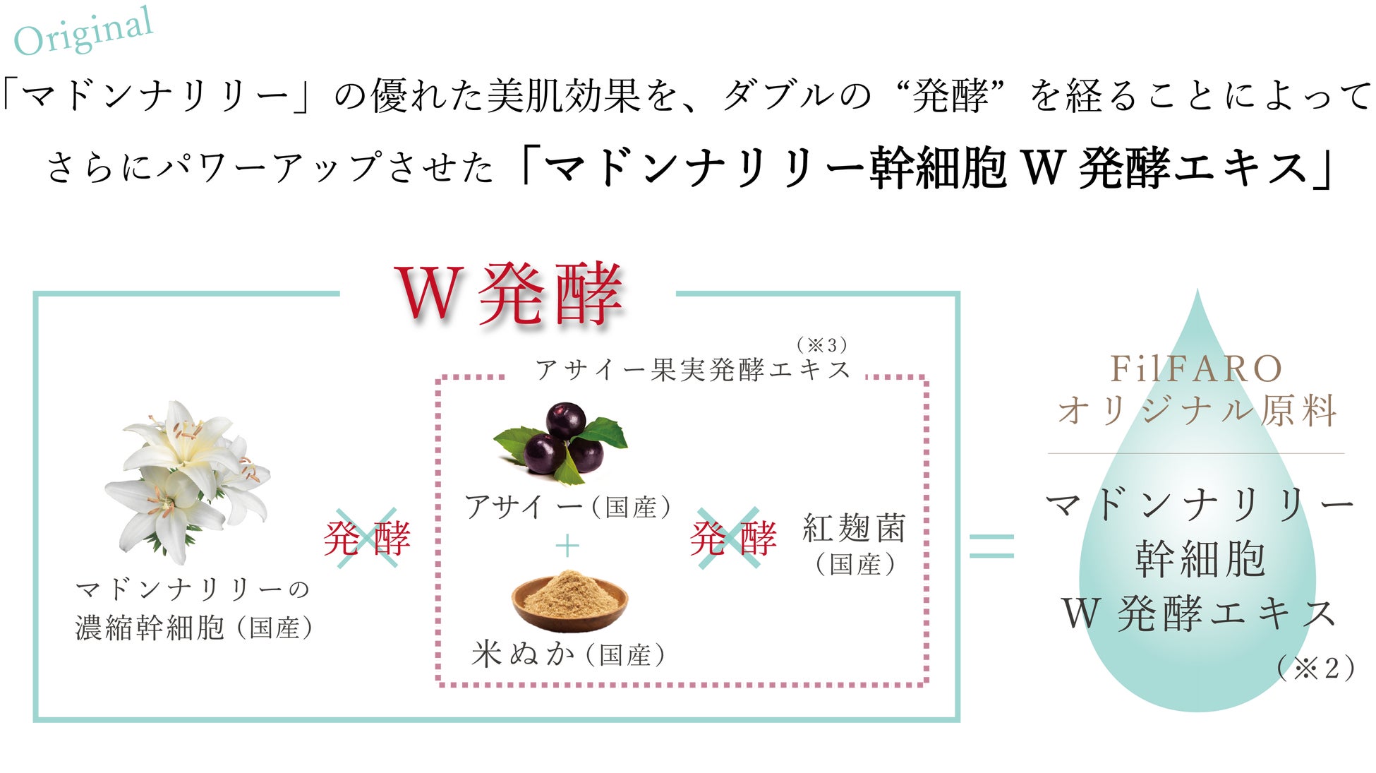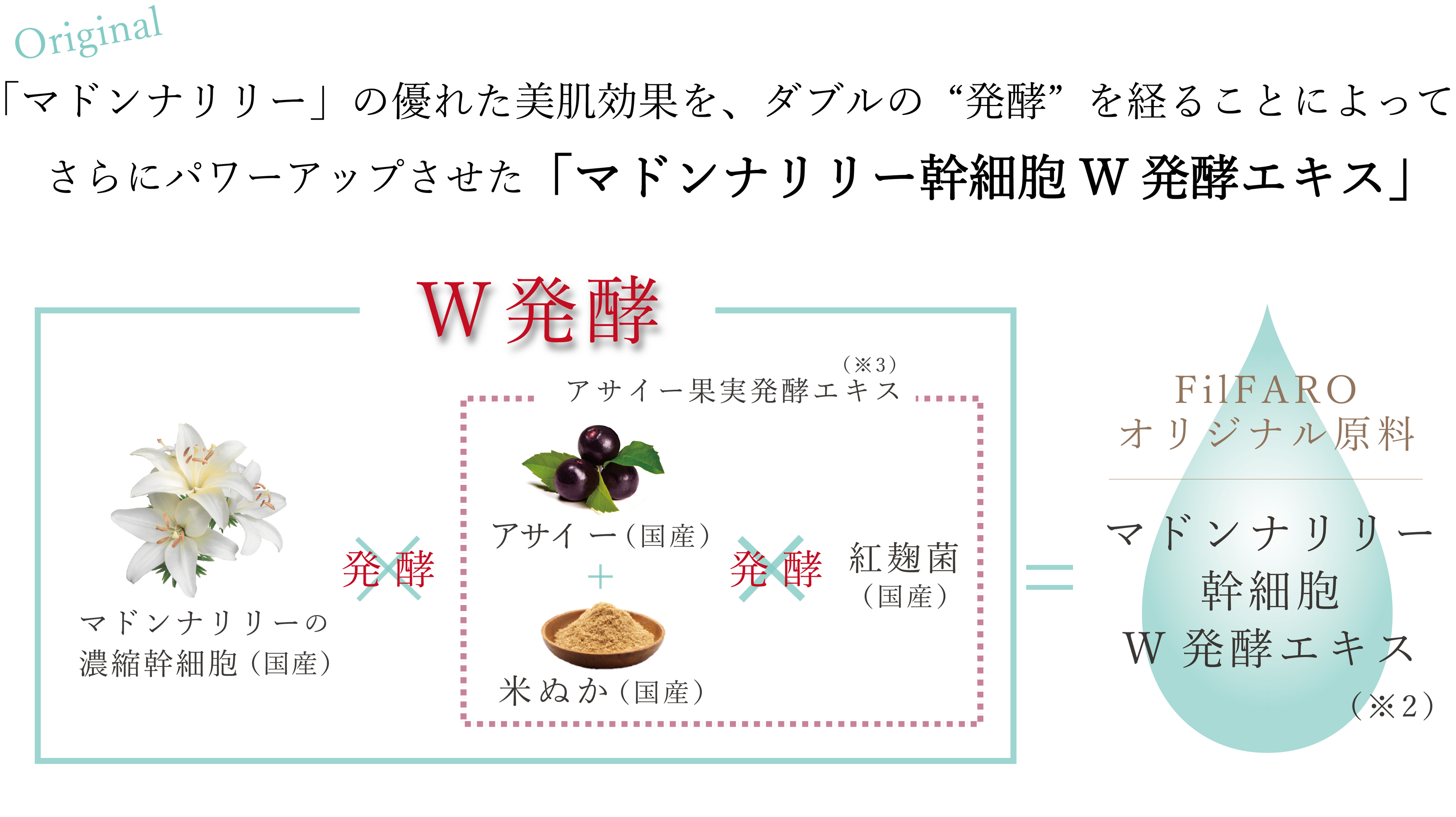 3つの巡り・整うアプローチ②:FilFAROオリジナル国産美容保湿成分「マドンナリリー幹細胞W発酵エキス(※で)」で巡り・整う