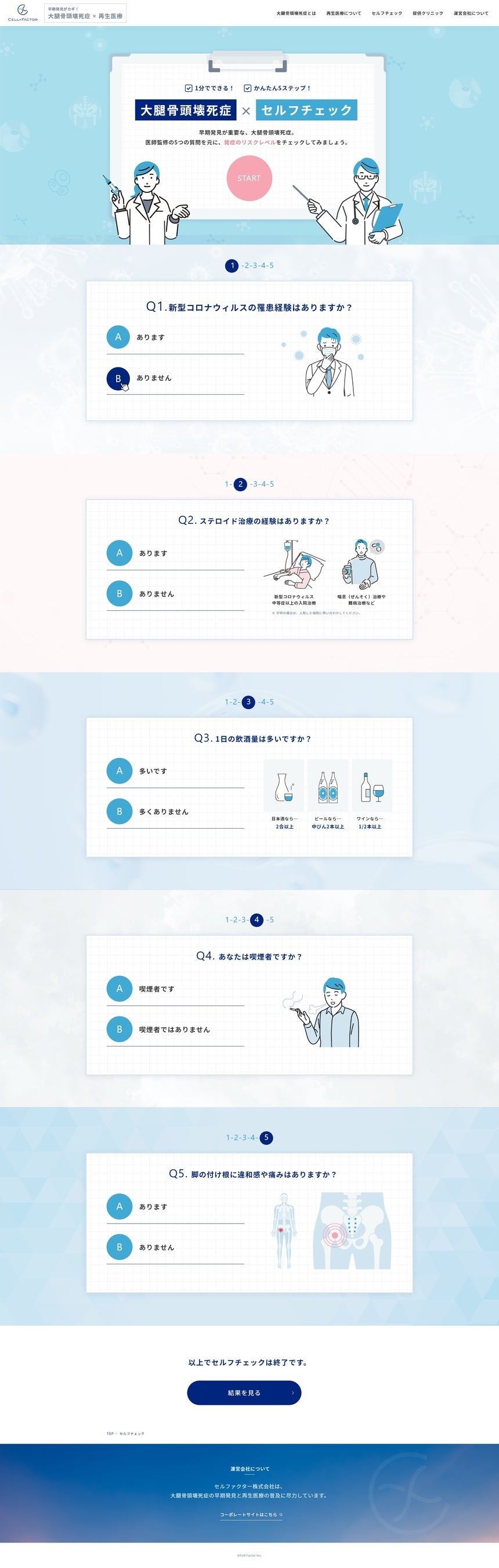 本サイトは、大腿骨頭壊死症(ONFH)と再生医療の早期治療について、広く⼀般社会に認知拡⼤・理解促進をすることを目的としています。併せて、医師監修の5つの質問を元に発症のリスクレベルを気軽にセルフチェックできるコンテンツを発信しています。