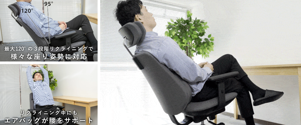 「Airly Chair」は背もたれの角度を95度/110度/125度の3段階で自由に調整可能。