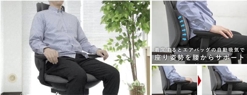 「Airly Chair」の最も大きな特徴は、空気のクッションによる快適な姿勢サポート。