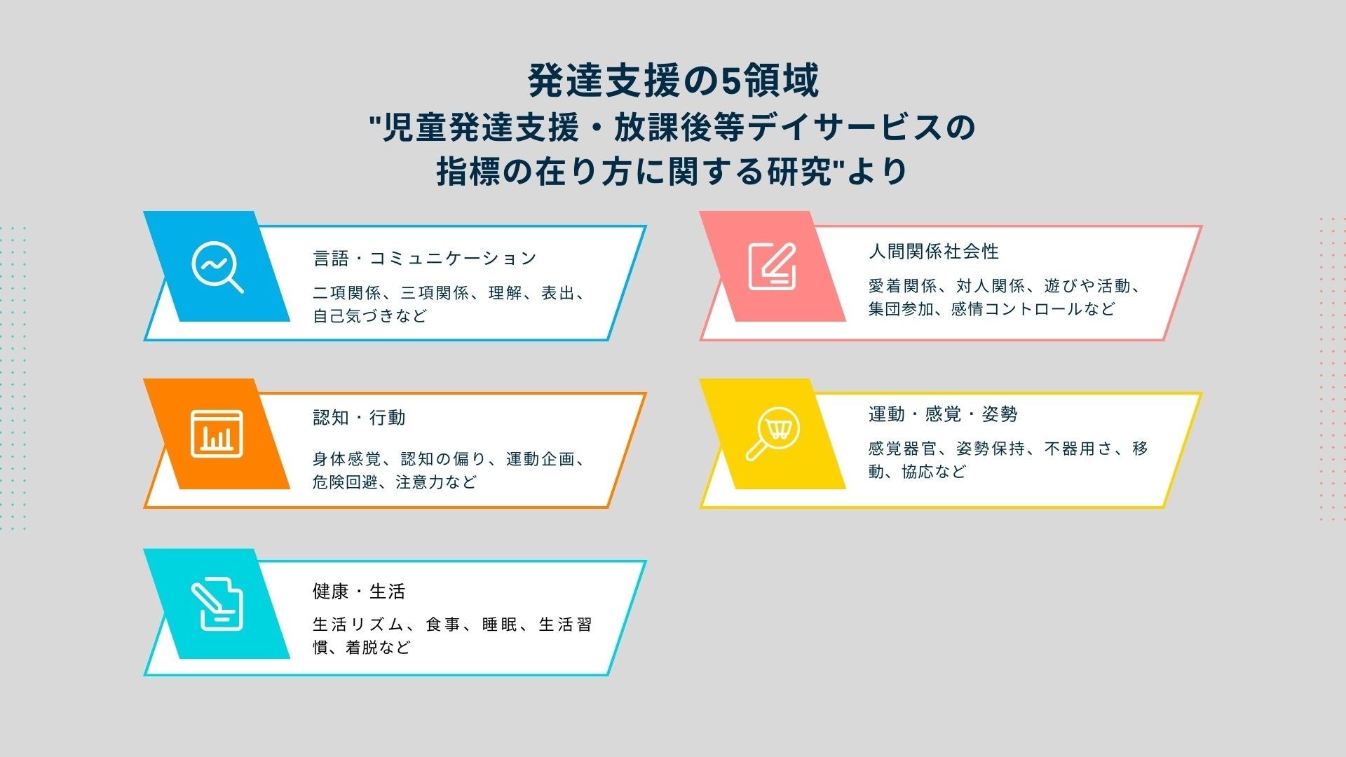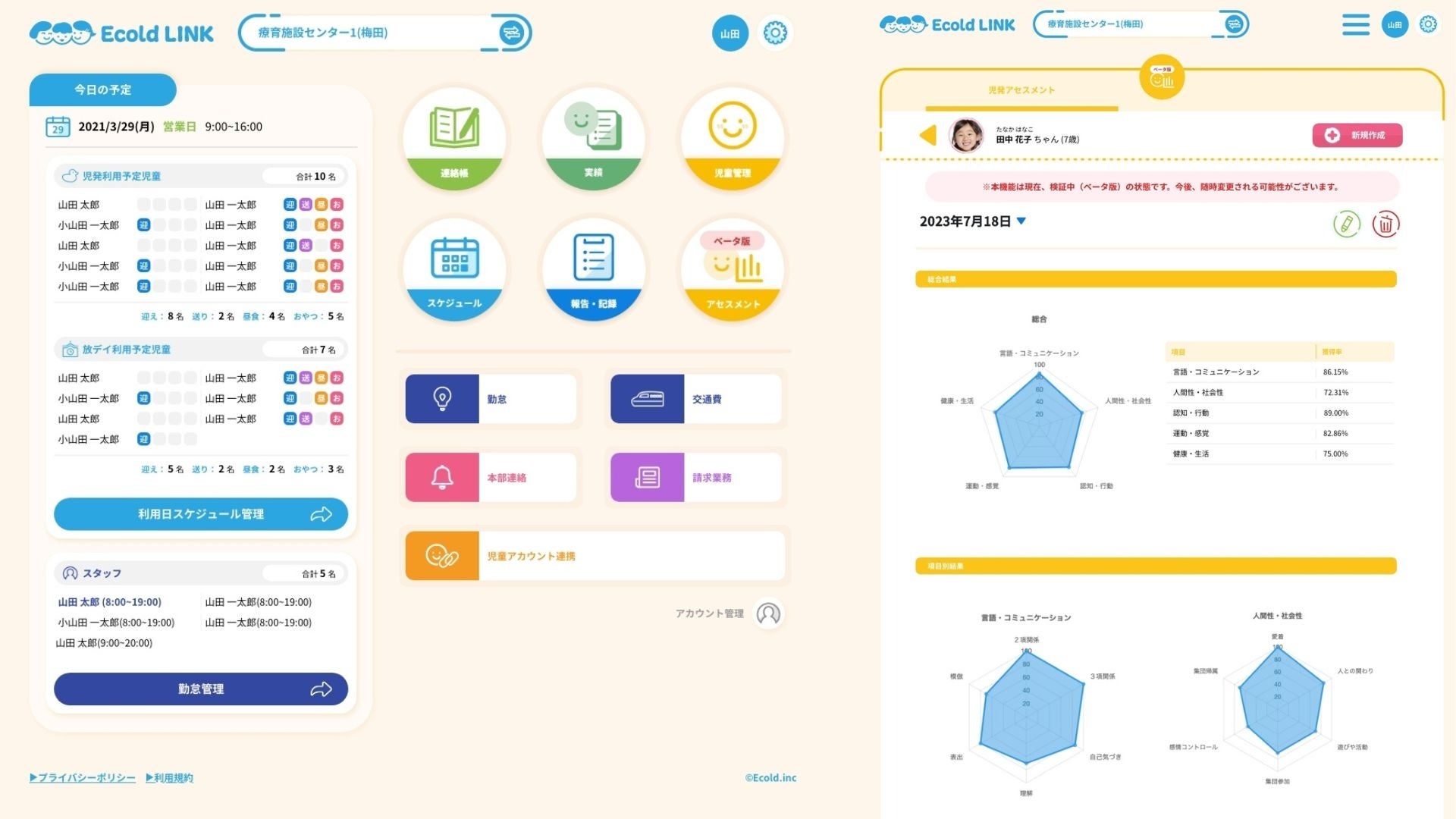 デジタルツール「Ecold LINK」は、保護者や発達支援施設との間で日常生活の情報を収集。さらに、厚生労働省の最新の研究に基づく5つの発達領域(言語・コミュニケーション、人間関係・社会性、認知・行動、感覚・姿勢・運動、健康・生活)を分析の中心として活用します。この独自の方法により、児童発達支援や放課後デイサービスの個別支援計画の原案作成やモニタリングの評価が効果的に行え、発達支援の質が一層向上することが期待されます。