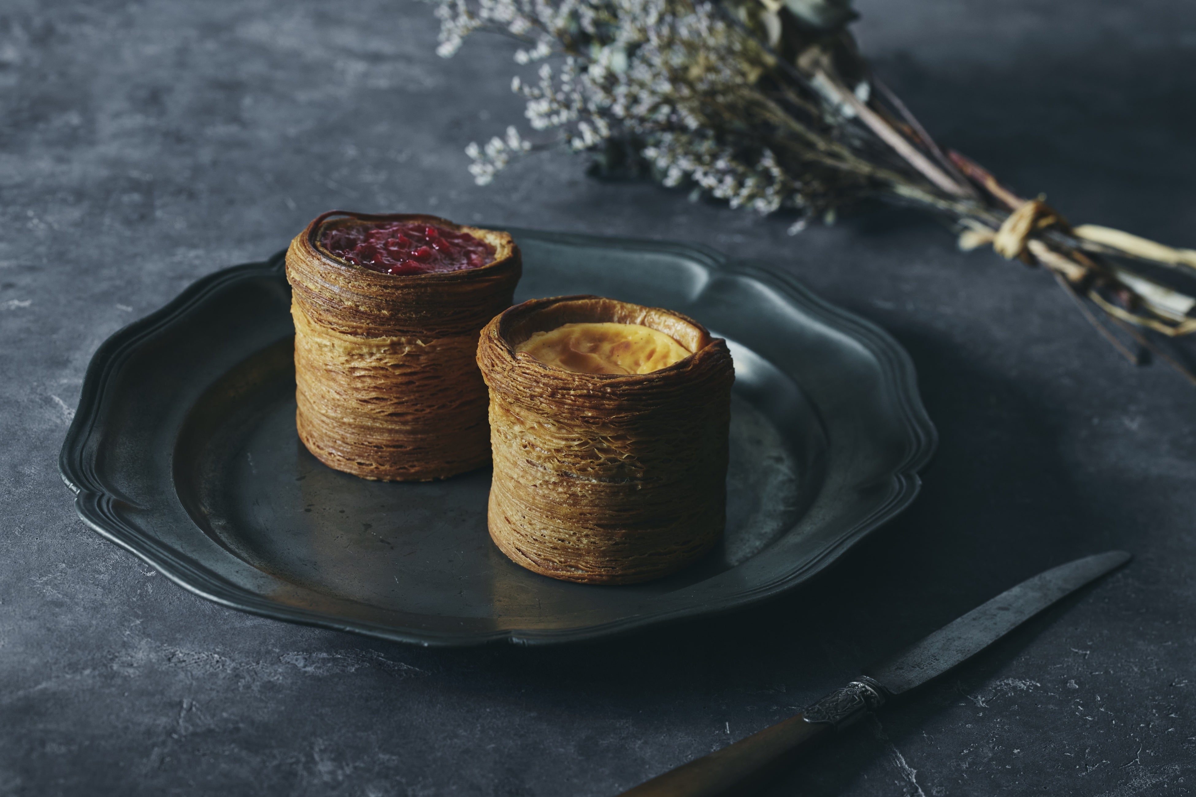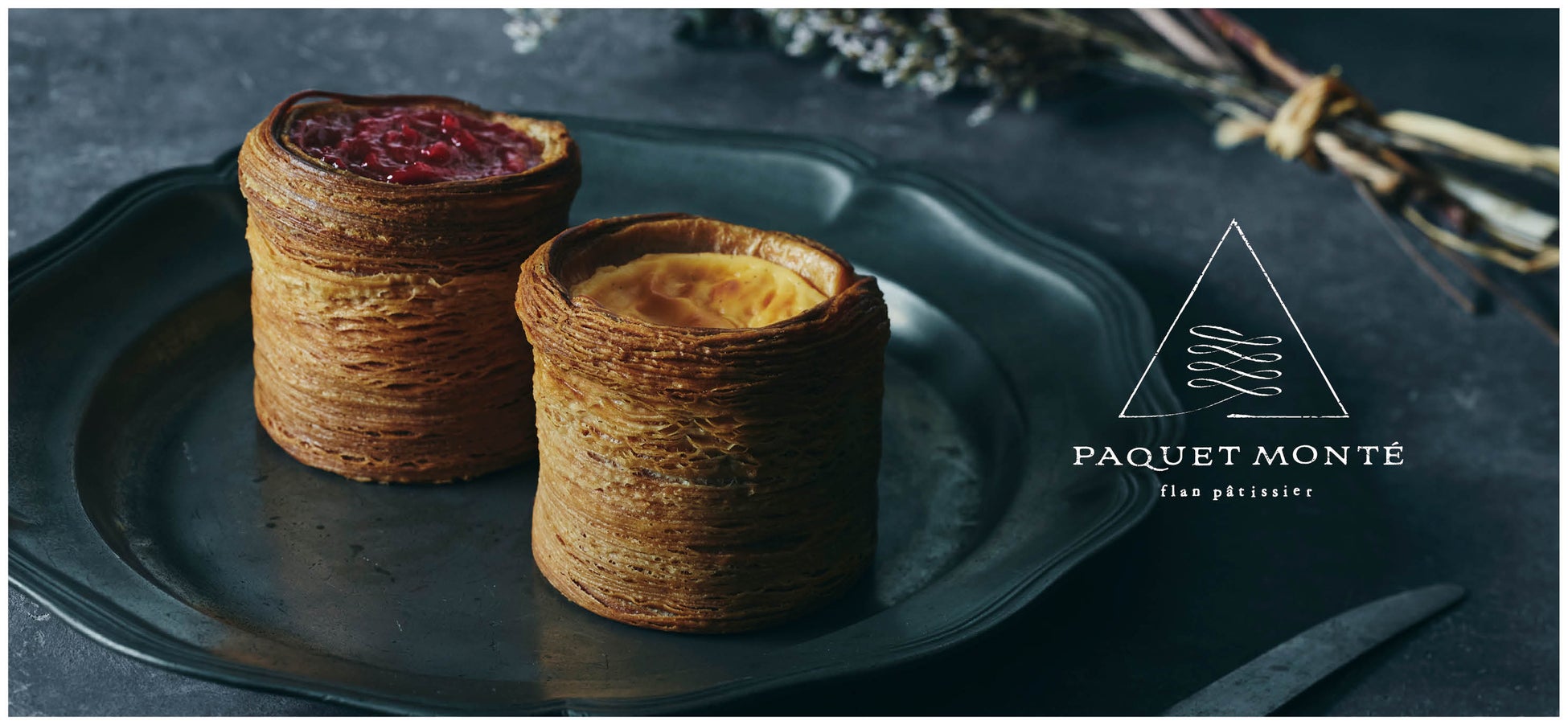 商品コンセプトは「コントラスト」。高度な技術を要する何層にも織りなす筒状のパイに、1g単位で研究を重ねたトラディショナルなフラン液を流して焼き上げ、食感のコントラストをお楽しみいただきます。本催事では2種をご用意いたします。常温でお持ち歩き可能です。