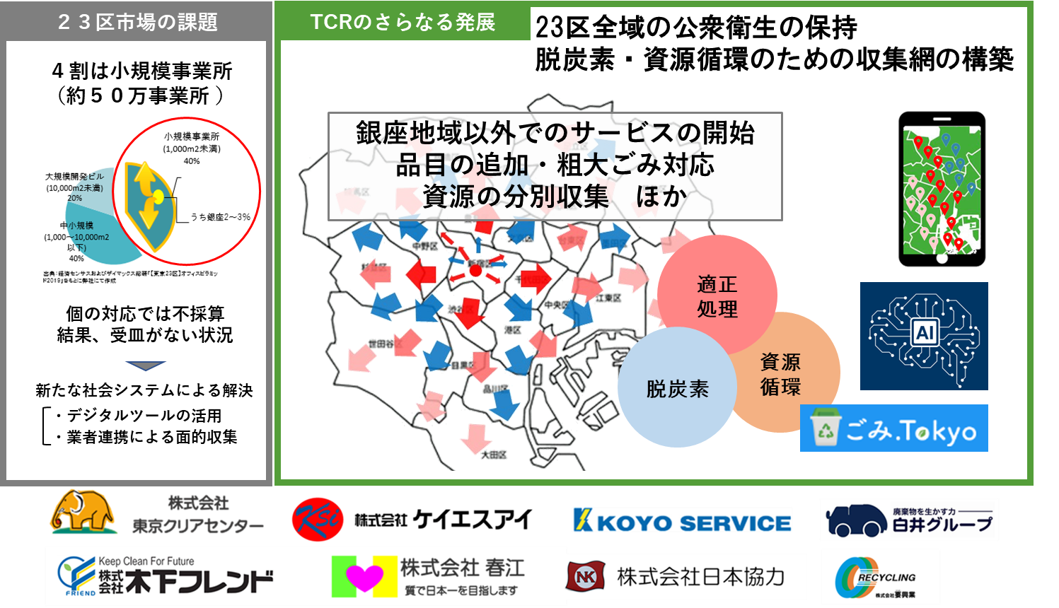 当協会は、1997年に銀座地区の害獣被害防止のために発足した銀座クリーンリサイクル推進協議会が2023年4月に法人化したもので、加盟8社の総売り上げは年間約280億円となります。廃棄物処理業のDXを促進するため、デジタル受付システムを共同使用し、行政・産業界・街の住民や事業者の方々と連携しながら持続可能な都市環境の実現に向けてさまざまな取り組みを展開して参ります。