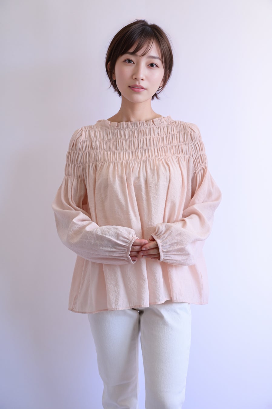 胸元のギャザーと淡いピンクが可愛い印象のブラウス。主役級の1枚なので、シンプルでボリュームを抑えたボトムスとよく合います。落ち感のあるシルエットとボートネックでスッキリとした印象で、大人の女性にも気兼ねなく着てもらえる一枚です。