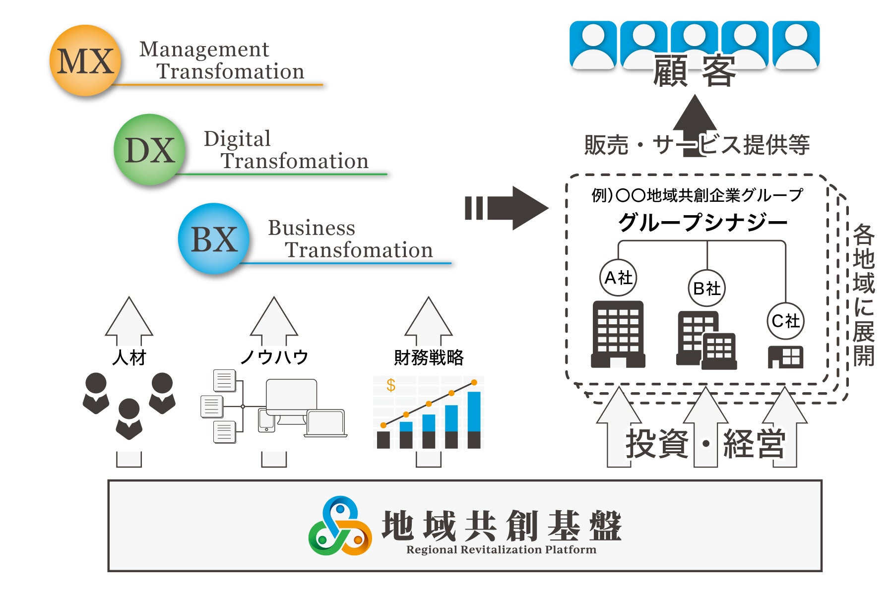 「地域共創基盤」構想は、「無い無い尽くしの中小企業は『個』で戦うより、強みを持ち合い、弱みを補いあって『集団』で戦うべき」という事業コンセプトに基づいています。CFOジャパン株式会社グループの経営・財務・DX等のコンサルティング、人材開発(人材が育つ仕組み作り)などのリソースを活用しながら、個々の企業としての必要な経営改革を行いつつ、事業シナジーのある中小企業にグループ入りしていただくことで、「1+1」が「2」以上になる企業集団になることを目指しています。