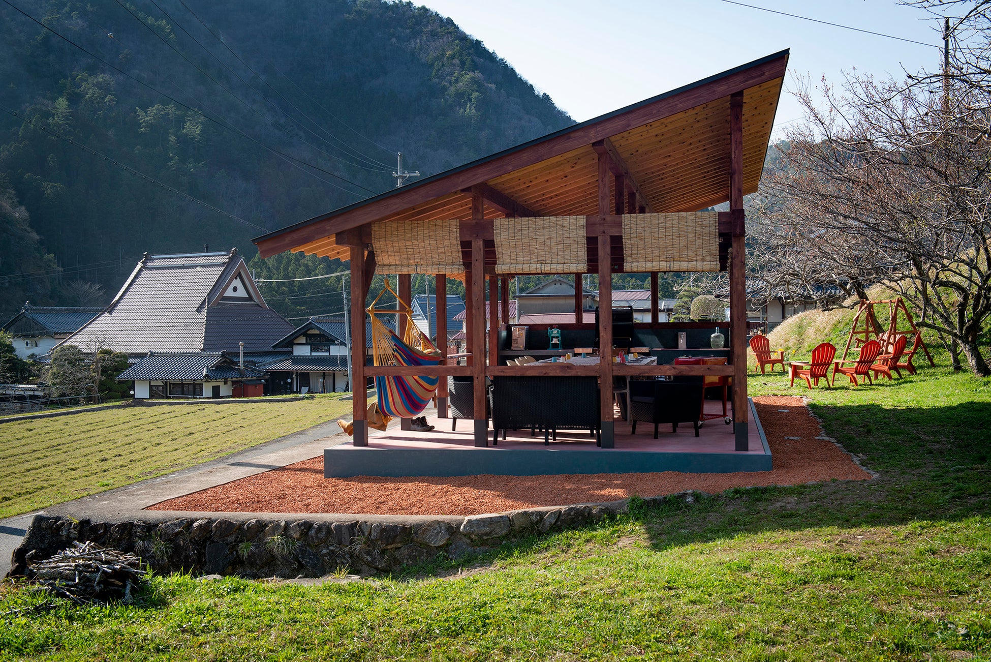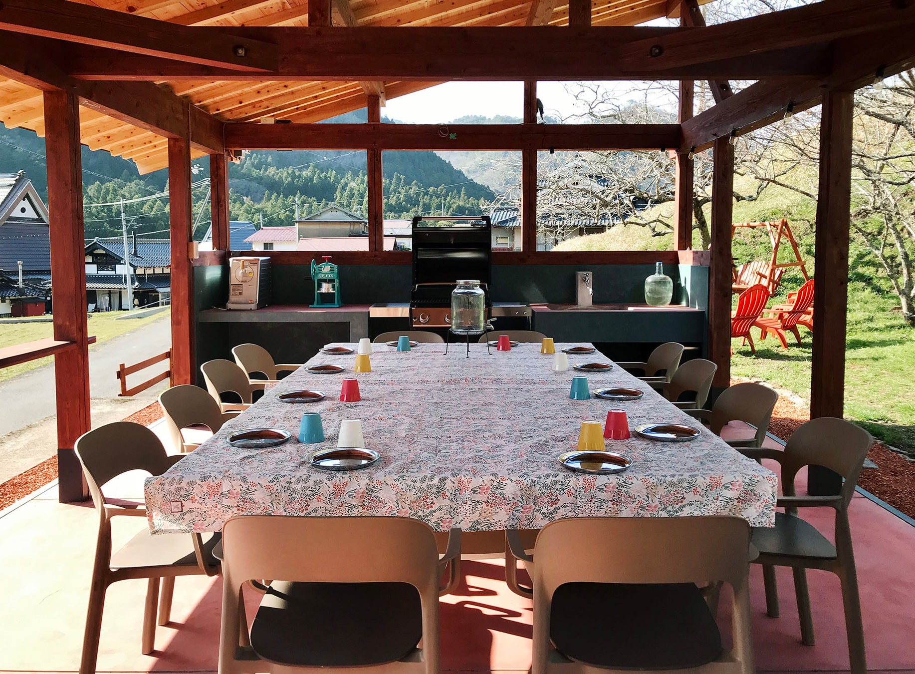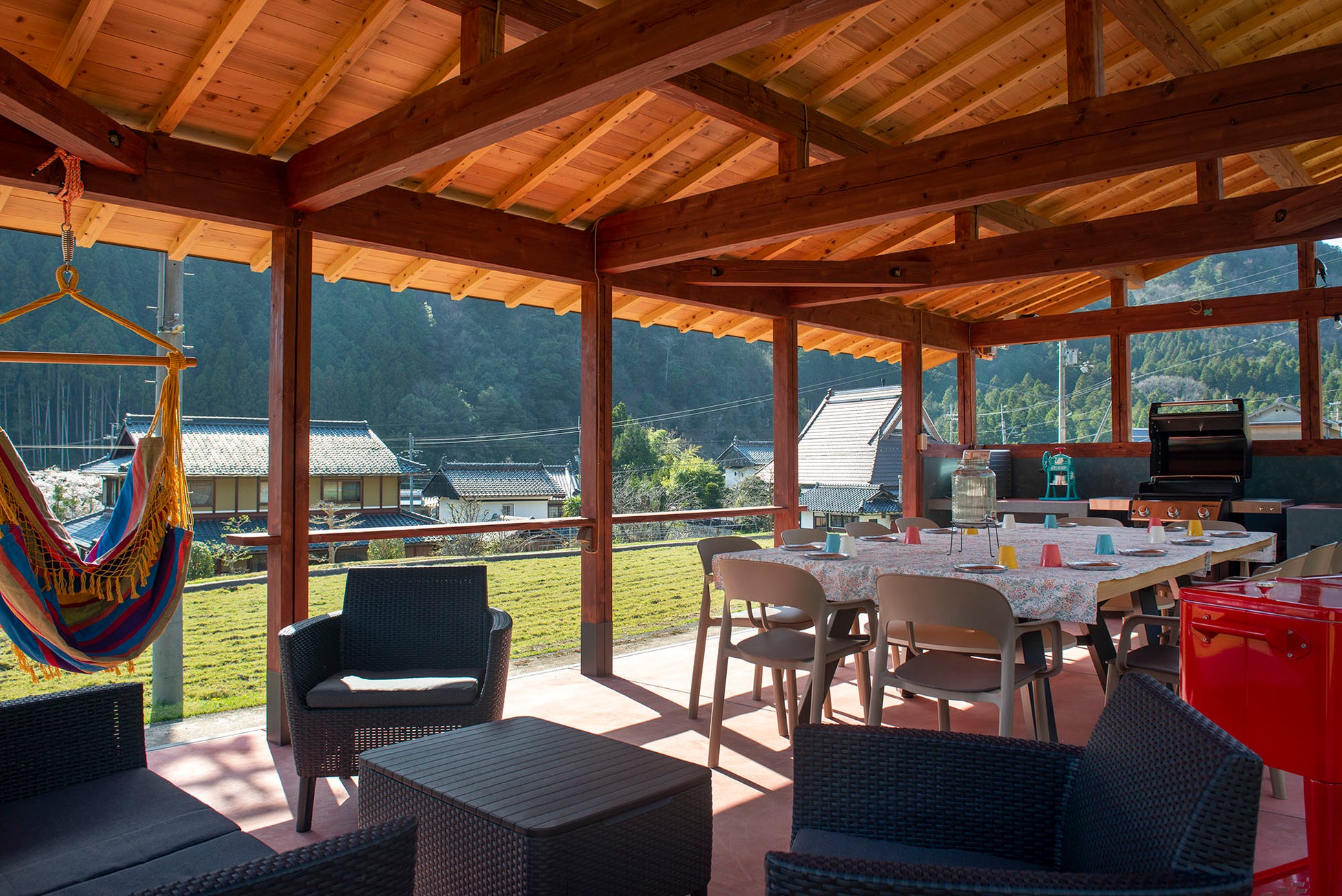 山々に囲まれた高台に建つ木造バーベキューハウスでバーベキューを楽しんで頂けます。バーベキューハウスからは、ハンモックに揺られながら山村風景が眺められます。大自然の中でラグジュアリーなバーベキューを楽しんで頂くため、ウェーバー社の10人用BBQガスグリルをご用意致しました。炭要らずですので、バーベキューに不慣れな方にも簡単に本格的なバーベキューを味わって頂けます。また、大人12人が座れる大きな(卓球台にもなる)テーブル、4人掛けのガーデンソファ、ハンモック、電源など様々な設備を整えました。屋根付きのため、夏の暑い日差しや、急な雨にも安心です。