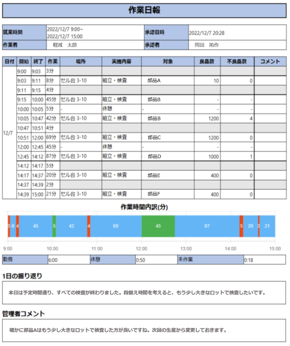 4:業務終了後は、各社独自に設定できる結果入力欄(例:生産数量や不良項目etc.)に業務結果を入力し、コメントを記入