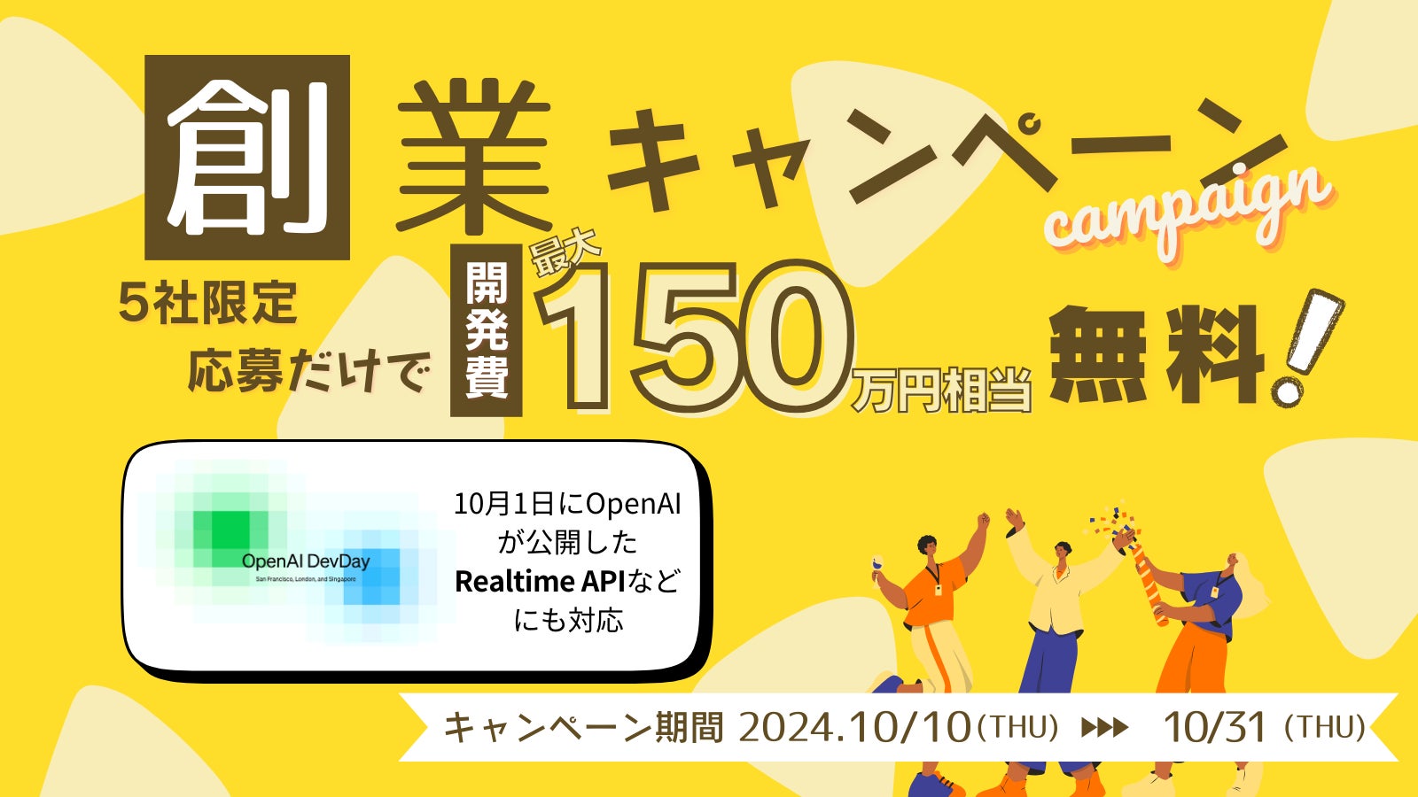ソフトウェア開発による新規事業支援を行う株式会社MedicalTalk(メディカルトーク、本社:東京都葛飾区、代表取締役:真野洋弥)は、RAGなどの生成AI技術を活用した新規事業立ち上げ支援のため、PoC開発で最大150万円相当が無料となる特別キャンペーンを2024年10月10日から開始します。今回のキャンペーンでは、限定5社までの企業に対してOpenAIのDevDay2024で発表されたRealtime APIなど最新技術を活用したPoC開発を特別価格で提供します。