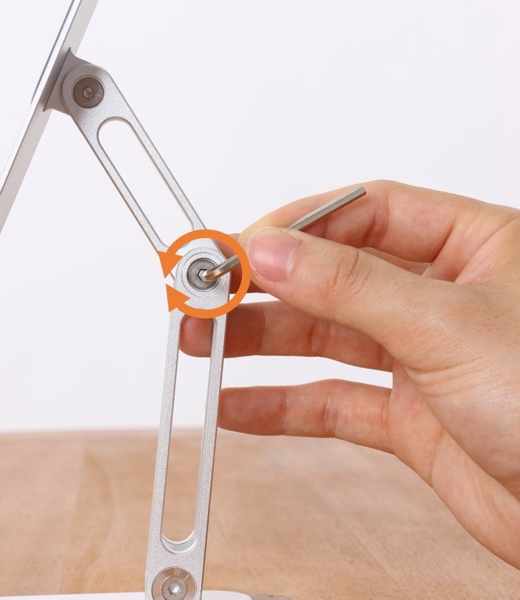 商品底面にあるL字レンチで関節部の硬さ調整が可能です。締め付けを強くすることで大型で重いiPad・タブレットも安定してお好みのポジションに固定することができます。また、経年による関節の緩みも補正ができるため永くスタンドをご使用いただけます。