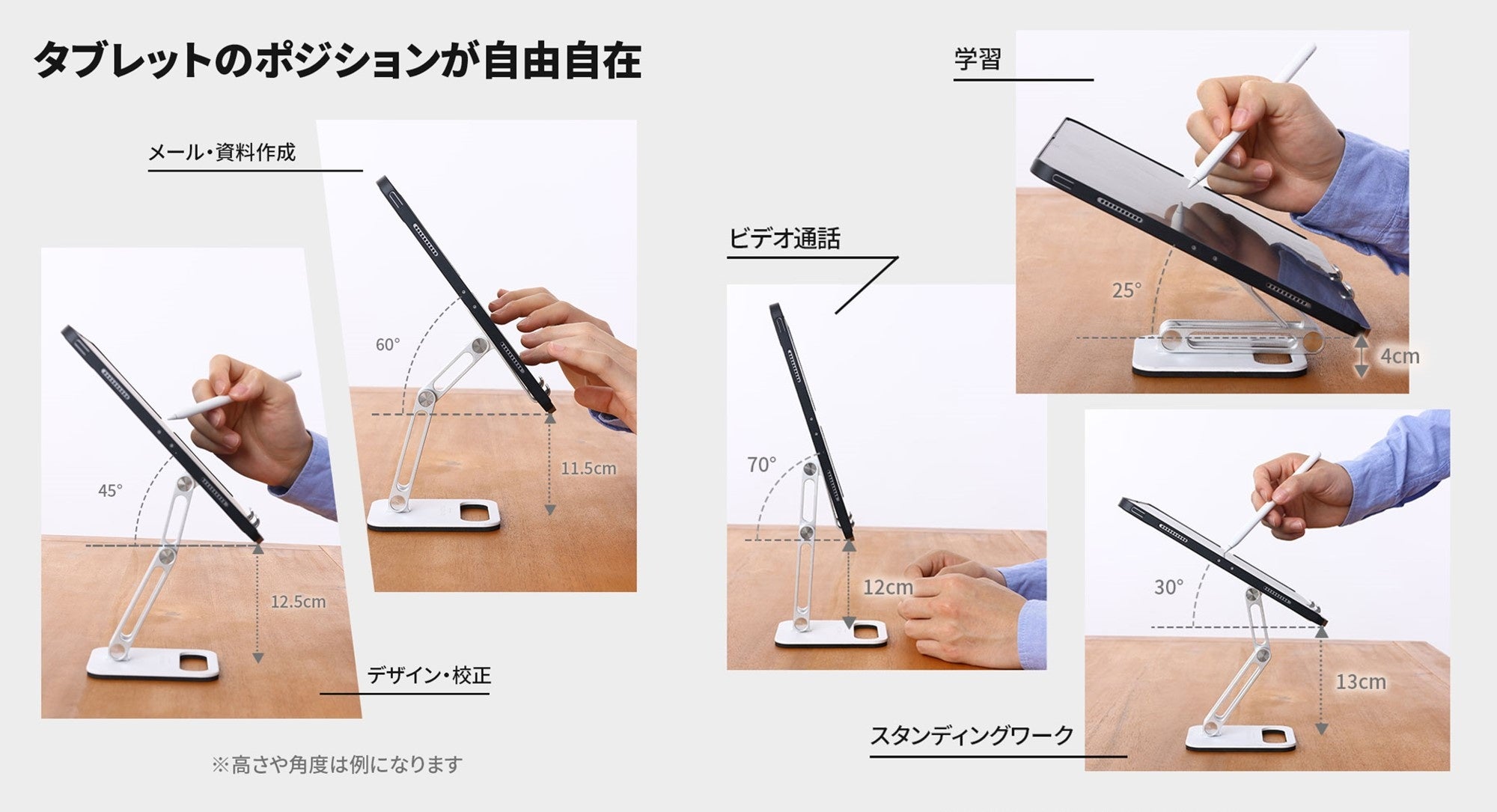 デジタルノマドやリモートワーカーのように場所に縛られずに働く人々、また学校や図書館で学習する学生を中心に、いつでもどこでもiPadやタブレットを安定させて使用したい、自分の好きなポジションで作業したいというニーズに応える製品となっております。また、適切な位置にタブレットを固定することで姿勢改善にもつながり、長時間の作業や学習の負担も軽減します。