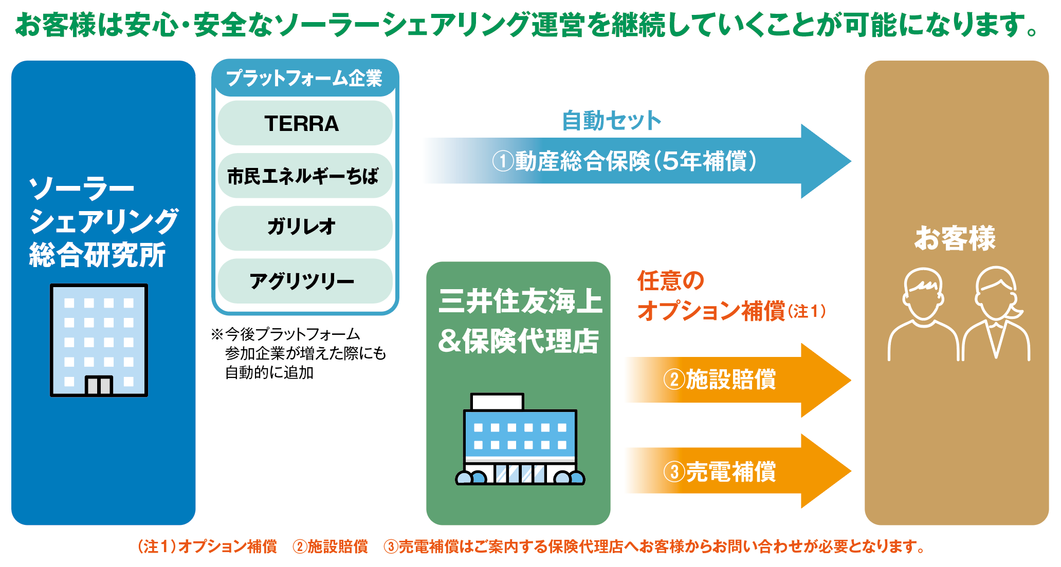 株式会社ソーラーシェアリング総合研究所(代表 合原亮一・東 光弘・西 光司 本社:東京都豊島区)は、三井住友海上火災保険株式会社(代表 舩曵 真一郎 本社:東京都千代田区)と連携し、 株式会社ソーラーシェアリング総合研究所のプラットフォーム企業(注1)が設置・施工したソーラーシェアリング(営農型太陽光)(注2)に対して、無償の補償(5年間の動産総合保険)を付帯し、ソーラーシェアリングの発展に貢献していきます。