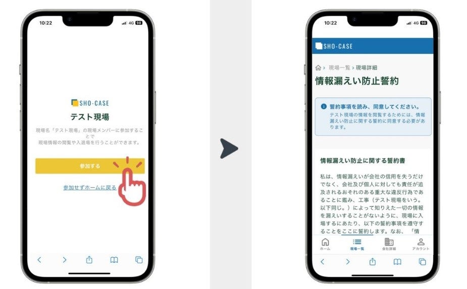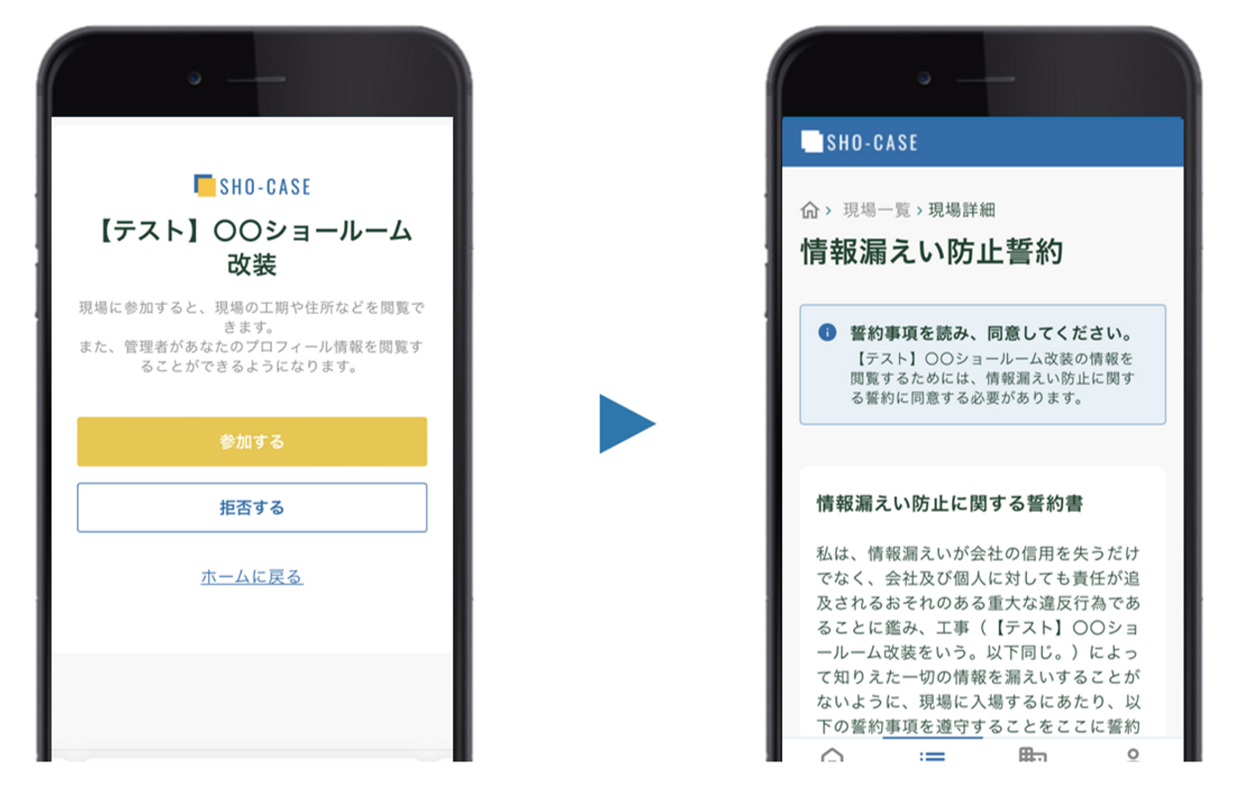 近年の情報セキュリティ課題の防止策として、現場作業員を現場招待したときに、現場情報を外部に漏らさないことを誓約する情報漏えい防止誓約を簡単に行うことができます。