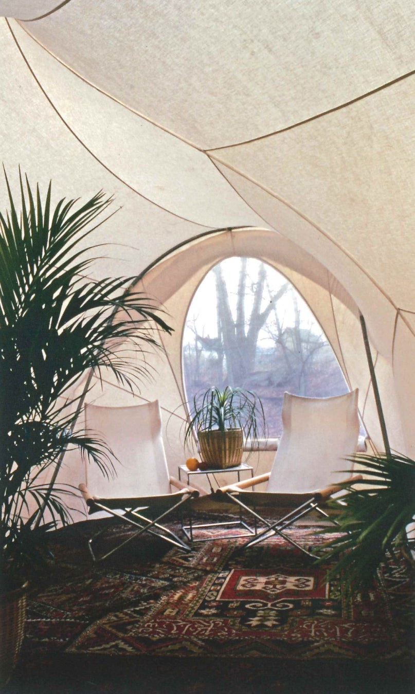 遊牧民ゲルやモスリン神殿を連想させる優美な曲線で構成される大型テント【オプティマム350】は、BILL MOSS氏が演出する曲線構造を代表する傑作で、「テントは人間が住むことのできる芸術作品」と言う名の通り数々のデザイン大賞に輝き、40年余を経た現代でも唯一無二の存在感を放つ最高峰のラグジュアリーテントです。