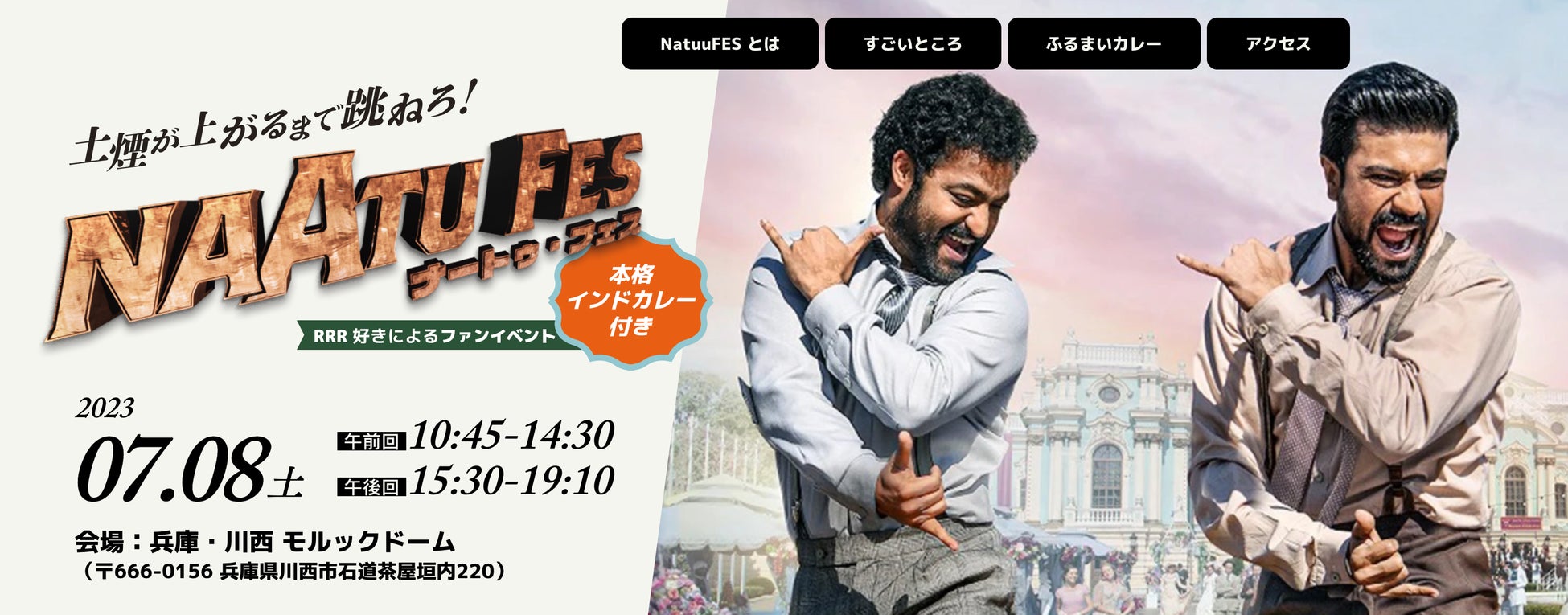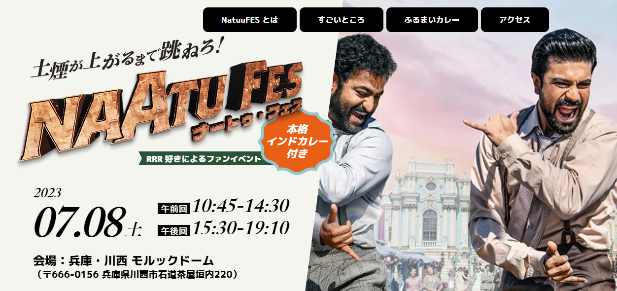 イベント会場と同じ川西市に店舗を構えるインドカレー店「ヨナナ」様が、ナートゥ・フェスの予約者限定で本格スパイスインドカレーを提供します。『RRR』のテーマでもあるドスティ(友情)にちなんだペア割「ドスティ割」でお得にイベント参加できるだけではなく、本格インドカレーもお召し上がりいただけます。