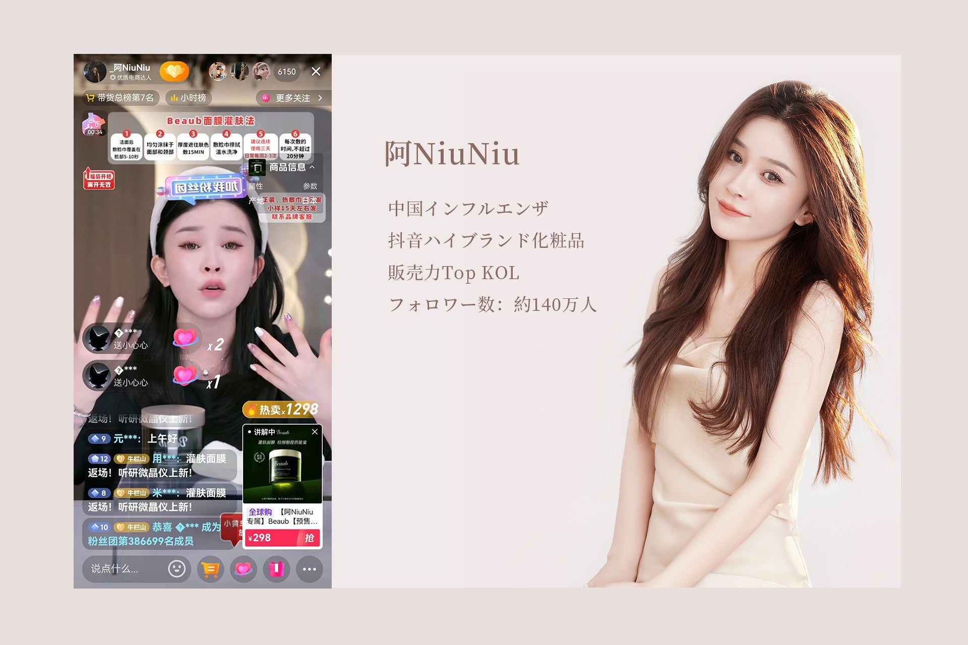 中国版TikTokの抖音(ドウイン)のハイブランド化粧品 販売力Top KOL「阿NiuNiu」、フォロワー数:約140 万人と在日期間19年 皮膚管理士経験10年の「麗麗酱在日本」、フォロワー数:約65万人の二人を通して、1週間にて発売したところ、発売から1週間目で売上総額が2000万円を突破しました。