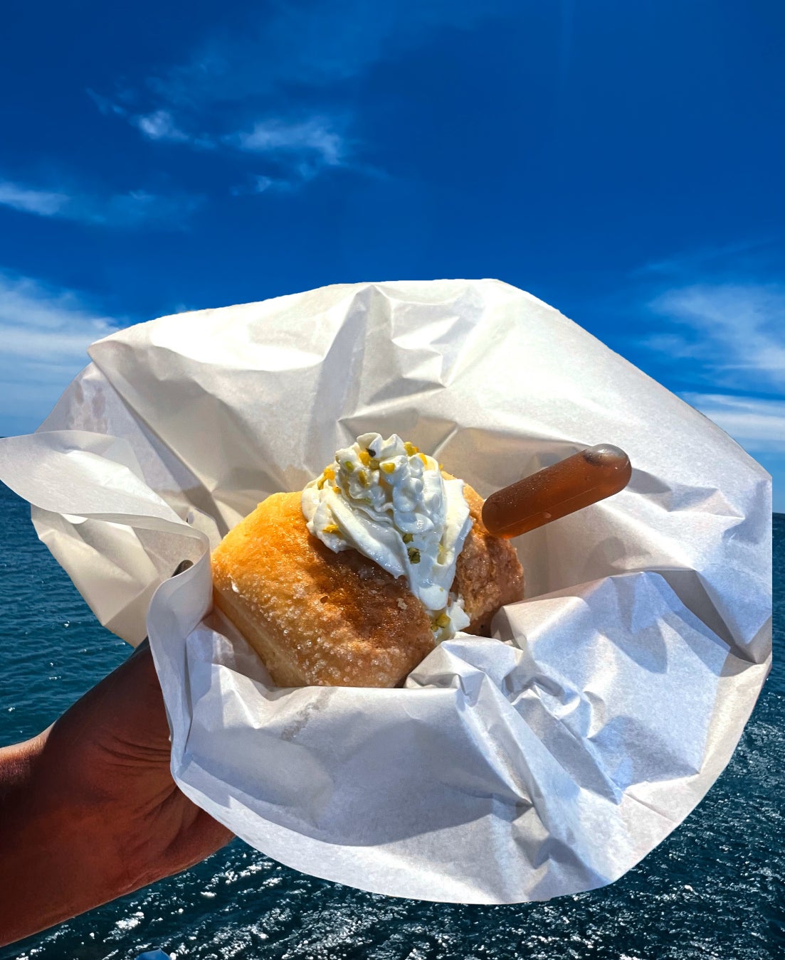 メロンパン部分はキンキンに冷えており、中にはたっぷりのふんわり冷え冷えのクリームチーズが入っています。そこに岩塩とメイプルソースが絶妙なアクセントとなり、これまでにない食体験をご提供します(メイプルソースはピペットになっている為、お好みで甘さを調整できるようになっております)