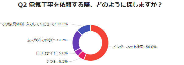 どのように電気工事を探しているかは、56.0%が「インターネット検索」と回答し、オンラインの接点を増やすのとSEOを強化する必要があると感じました。
