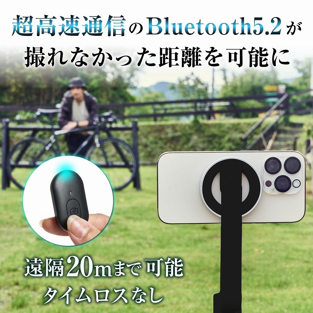 iPhoneだけでなく、もちろんAndroid機種のスマートフォンにも対応するシャッターリモコンは、通信距離が最大20mとなり、遠距離での撮影、お好みのアングルでの撮影、大人数での集合写真撮影など、様々なシーンで活躍します。
