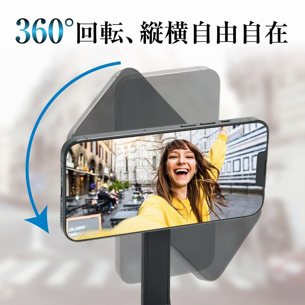 スマートフォン取り付け部のアーム角度は180°開閉でき、上からのアングルや背景をメインにした撮影など、アームの角度だけで様々なシーンの撮影をお楽しみいただけます。