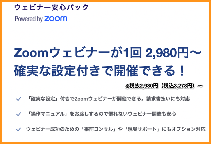 「ウェビナー安心パック Powered by Zoom」はZoom Webinersを利用したウェビナーが1回あたり2,980円(税込3,278円)〜開催できるサービスです。