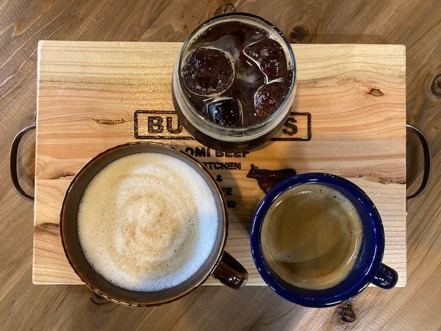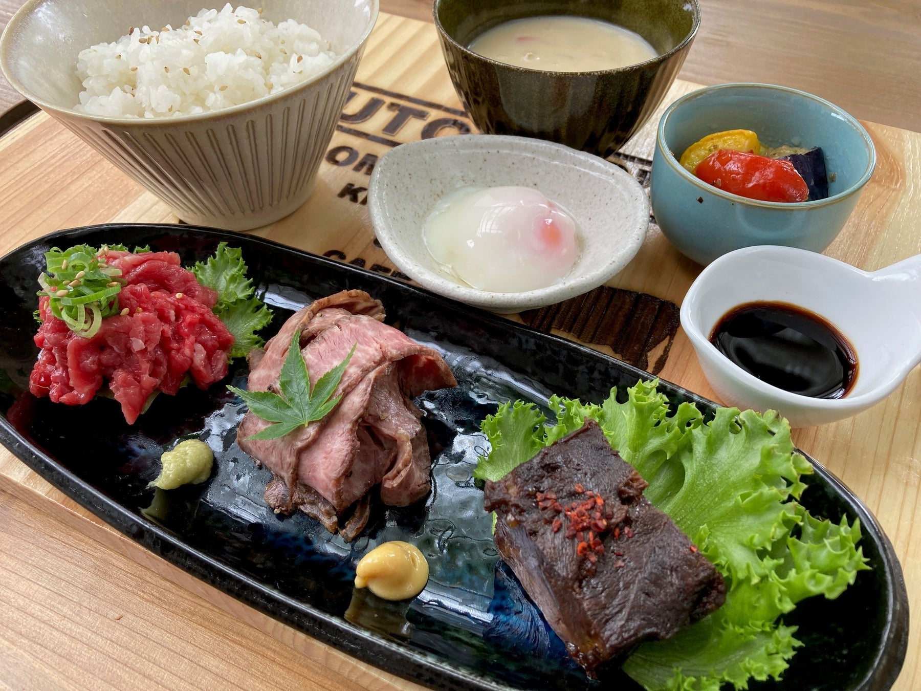 BUTCHER'Sでは本格的なエスプレッソ抽出したコーヒーや滋賀県在住のパティシエの方と提携してご用意した手作りのケーキ、また極上の近江牛で作られた様々なメニューをランチで提供、その日よってお得なドリンクとセットの日替わりメニュー(ローストビーフ丼やハンバーグ、パスタなどいずれも近江牛を使ったメニュー、税込み1,550円)もご用意。看板メニューの近江牛3種盛り(税込み2,150円)は近江牛のトロユッケ、ローストビーフ、角煮が一度に味わえる豪華でリーズナブルなメニューです。