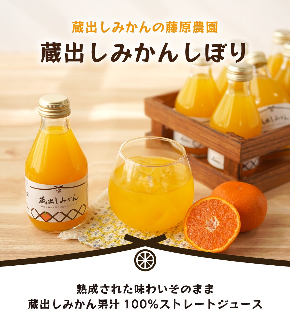 蔵出しみかんしぼりはもちろん果汁100%ストレート。保存料、着色料等は一切加えていません。熟成された蔵出しみかんの素材の味そのままに搾りあげたみかんジュースはお子様でもお年寄りでも安心してお召し上がり頂けます。