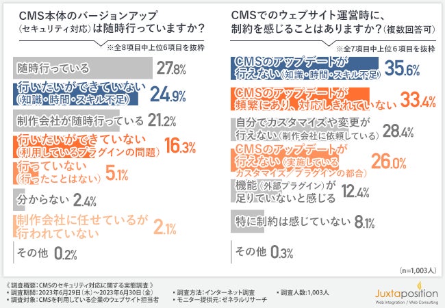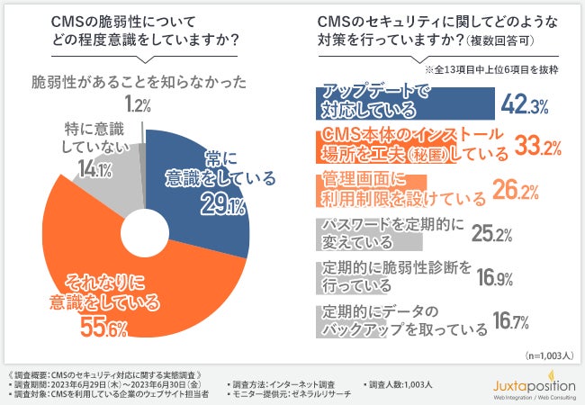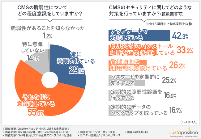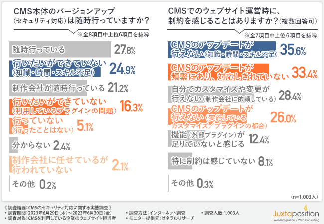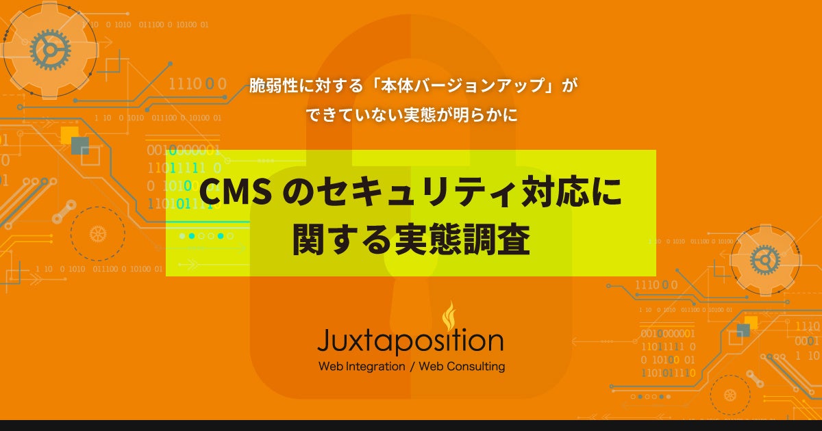 株式会社ジャクスタポジション(所在地:札幌市中央区、代表取締役:西山 泰史)は、CMSを利用している企業のウェブサイト担当者を対象に、「CMSのセキュリティ対応」に関する実態調査を実施しました。