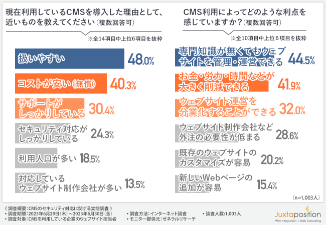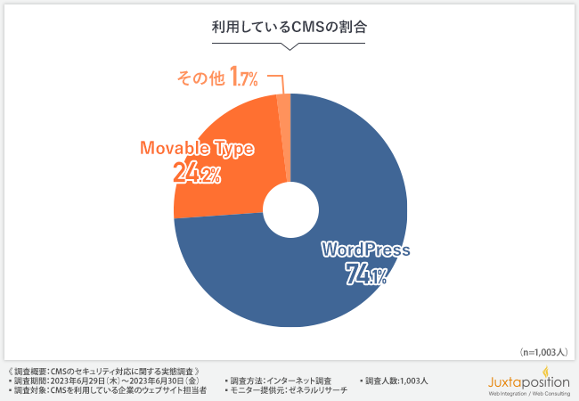 今回、Movable Typeを利用した安心・安全なウェブサイト運営をサポート(https://www.juxtaposition.co.jp/service/secure-with-mt/)する株式会社ジャクスタポジションでは、CMSを利用している企業のウェブサイト担当者を対象に、「CMSのセキュリティ対応」に関する調査を実施しました。