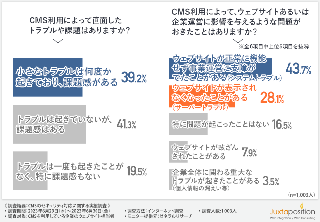 しかし、今回の調査結果から明らかになったのは、およそ半数の企業で「CMSの適切なバージョンアップ」が行えていない実態と、8割以上の企業で「CMSが原因となったウェブサイト運営時のトラブル」が生じた経験がある事実でした。