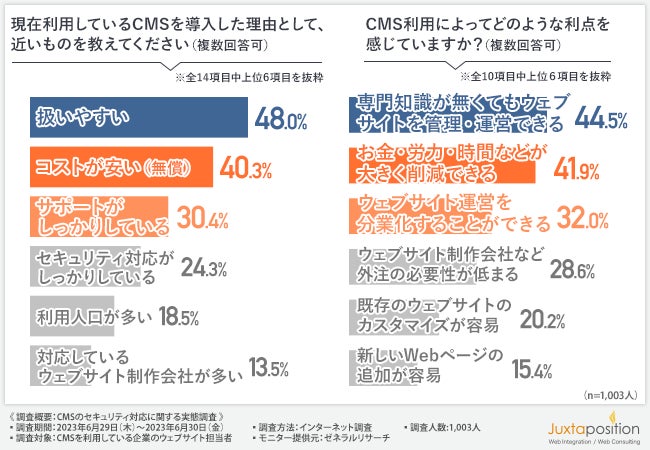 『扱いやすさ』と『コスト』を重視してCMSを選んだ方が多く、実際に感じている利点としても『専門知識不要で運用可能』『コスト削減』が多い結果となりました。