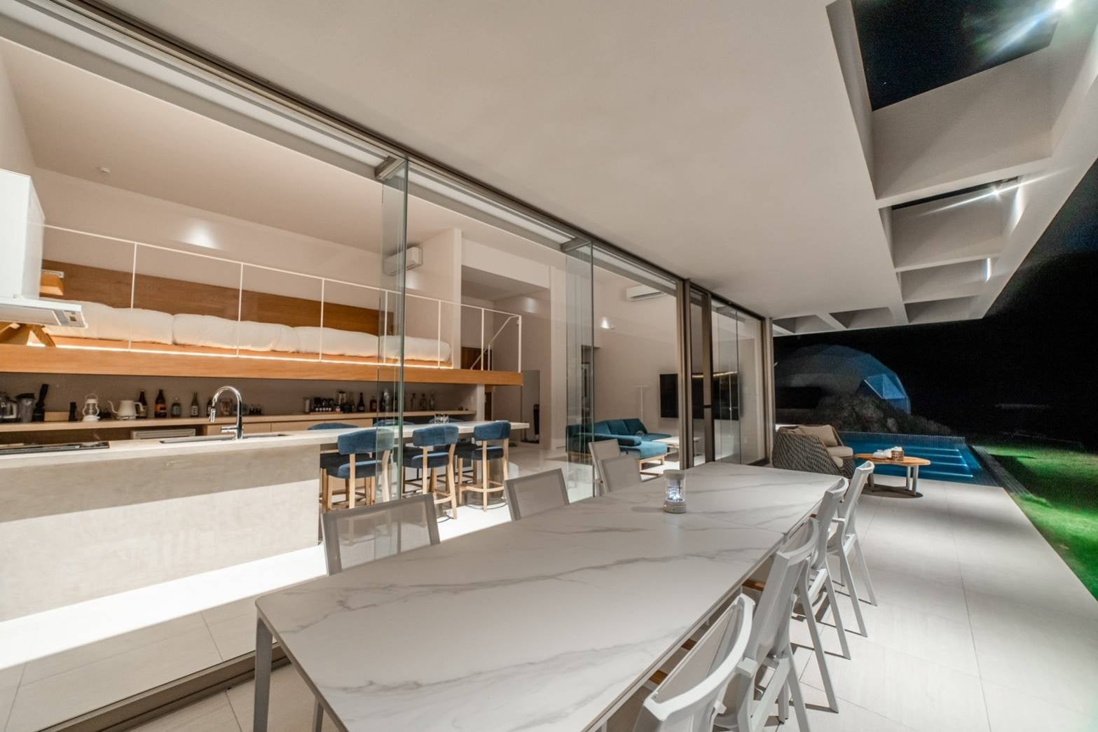 ヴィラタイプの室内には、高さ約4mの高い天井に絶景を眺めながらくつろげる広いリビング。ガラス張りの窓から見える海のパノラマをお楽しみください。