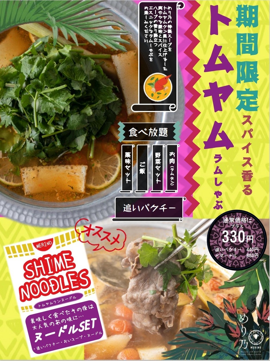 夏の食欲を刺激!!【夏の味覚冒険】として、2023年8月1日(火)~31日(木)の期間限定で、背徳感満載めり郎ラムしゃぶコース&辛味と酸味が夏にぴったり♪トムヤム風ラムしゃぶコースを1000円OFFで提供するキャンペーンを実施いたします。