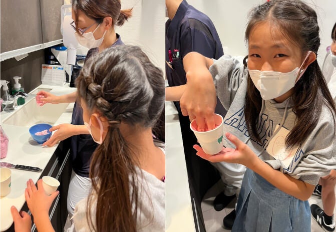 歯型取りで使用する「印象材」を使って手形作成を体験。作った手形はお持ち帰りいただけます。