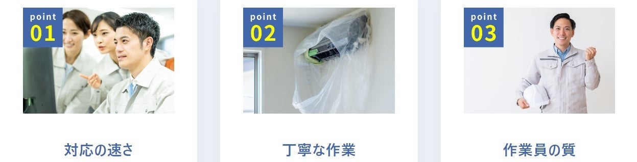 明るく気持ちの良い対応ができるプロの作業員のみを揃えているところも特徴のひとつです。清潔感のある服装はもちろん、親切・丁寧・誠実な対応を徹底してお伺いします。気持ちの良い対応に満足いただき、定期的に依頼されるお客様も多くいらっしゃいます。