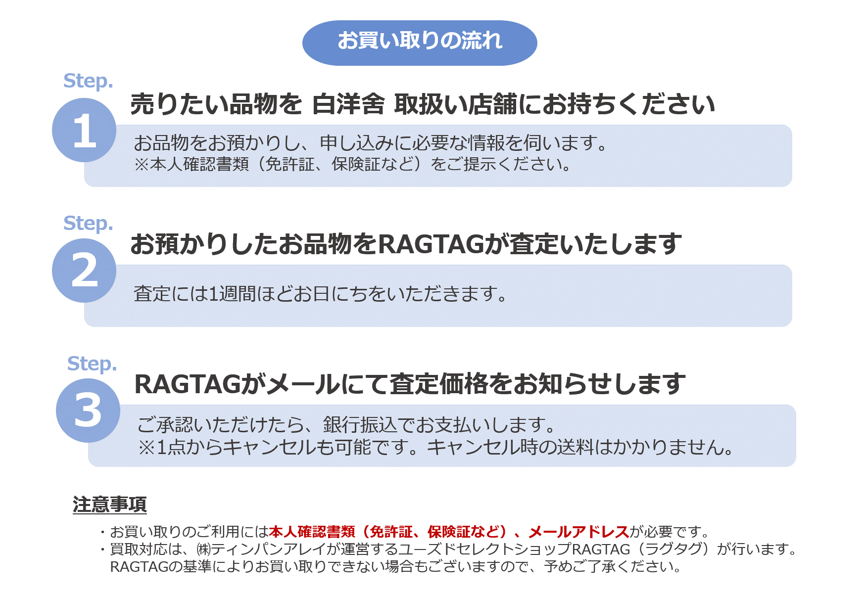お客さまが、白洋舍にお買取り対象アイテム(衣類・靴・バッグなど、白洋舍のクリーニングで受付が可能な物に限る)をお持ち込み・受付後、ティンパンアレイが査定・買取・買取金の振込を行います。