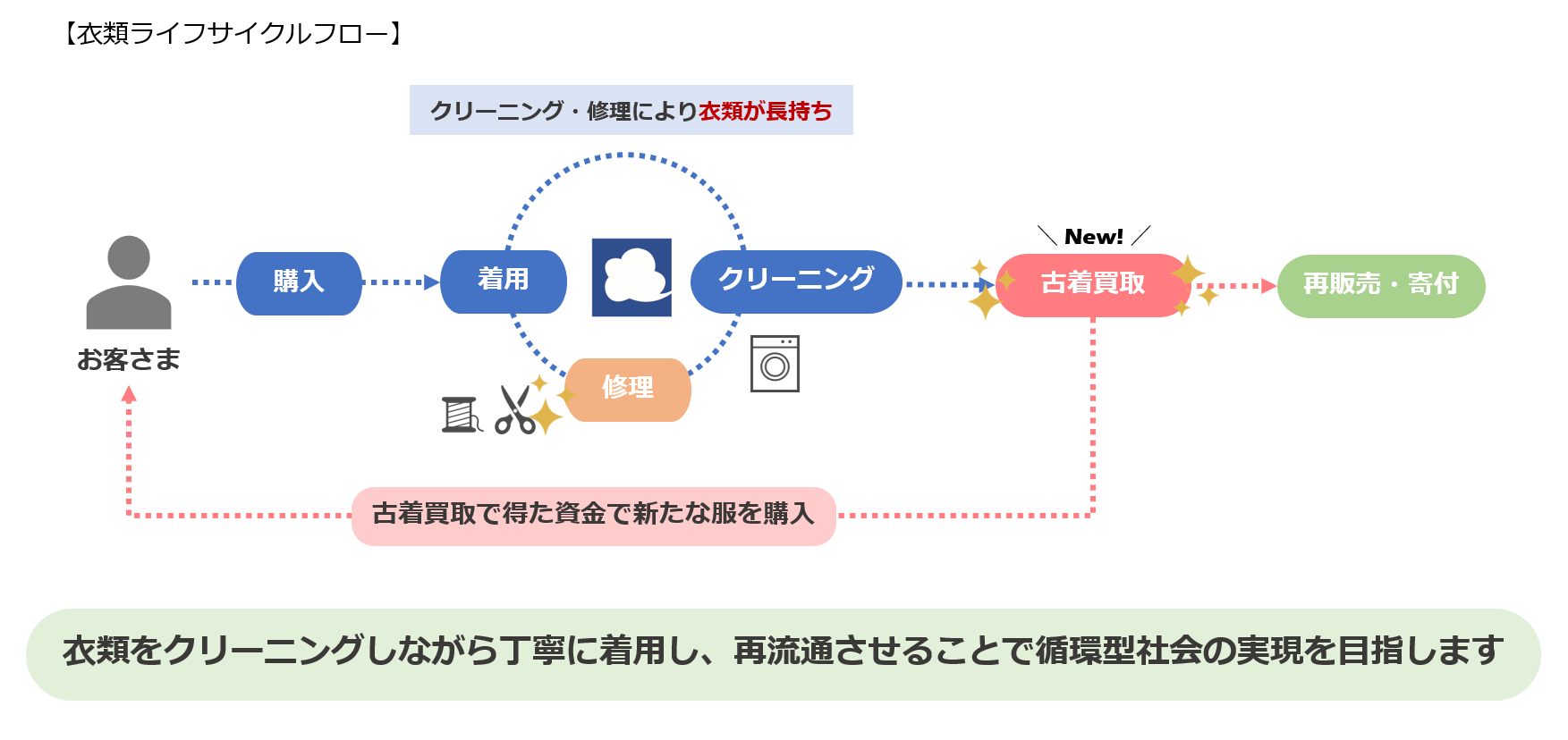 大切に着用された衣類を白洋舍のクリーニング・リペア技術でよみがえらせ、古着買取サービスによって二次流通させることで、持続可能な衣料品ライフサイクルを推進します。