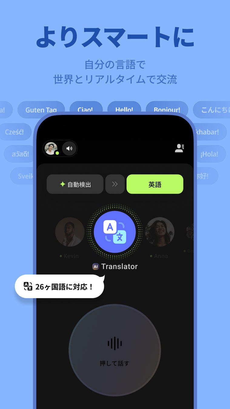 送った音声メッセージを他の言語に翻訳してくれます。使い方は非常にシンプルで、マイクに向かって話すだけで素早く翻訳ができます。