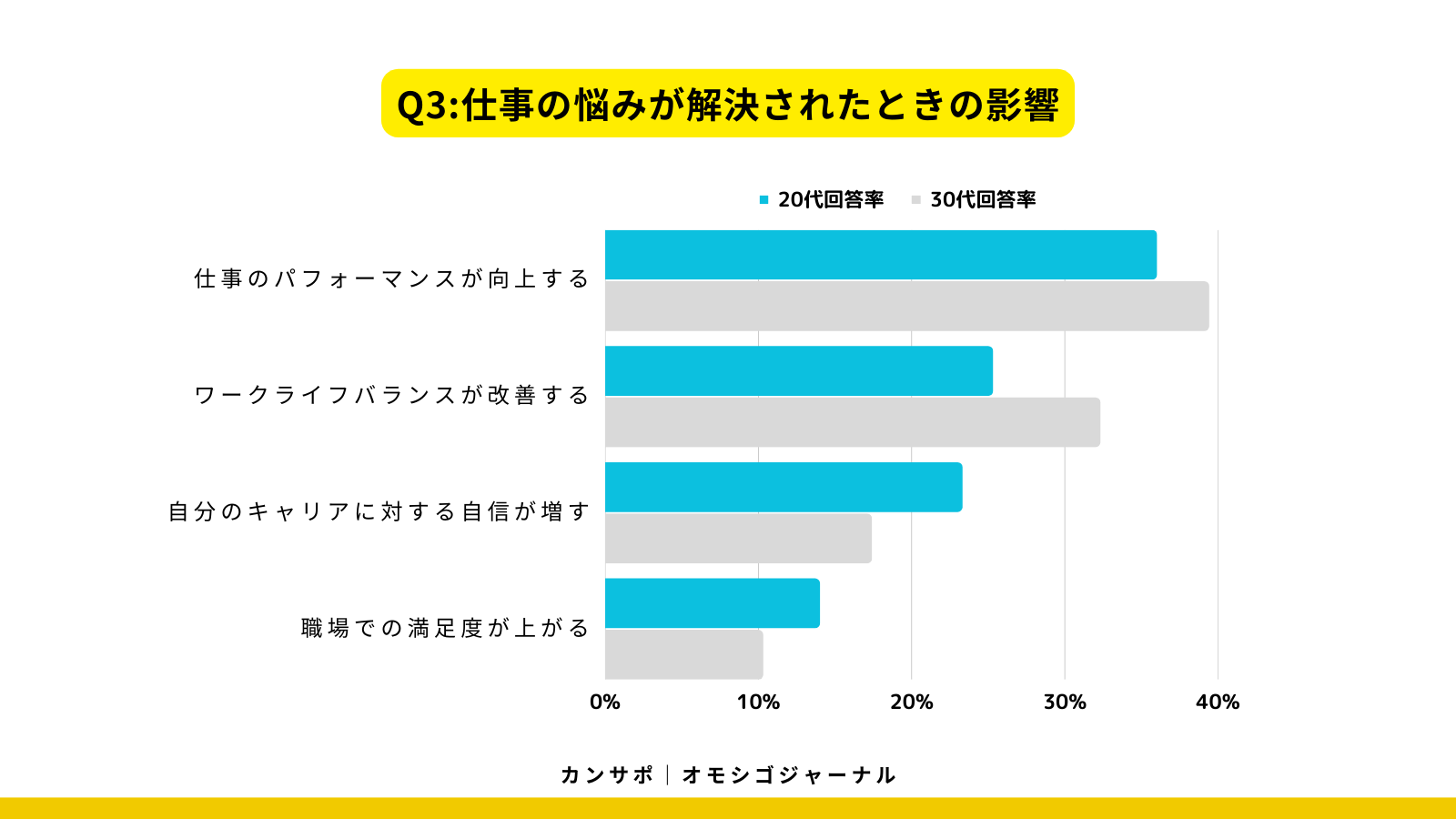 これらの悩みが解決された場合、20代(36.0%)、30代(39.4%)共に「仕事のパフォーマンスが向上する」と感じている人が最も多い結果となりました。