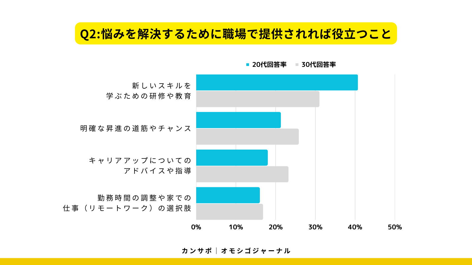 悩みを解決するためには、「新しいスキルを学ぶための研修や教育」が必要と選択したのは、20代の40.7%、30代の31.0%でした。また、20代で21.3%、30代で25.8%が「明確な昇進の道筋やチャンス」が必要と回答しています。