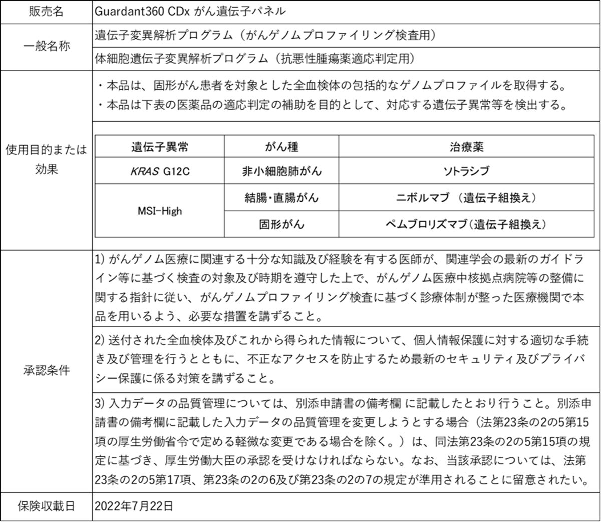 「Guardant360® CDx」は、ペムブロリズマブによる治療効果が期待されるマイクロサテライト不安定性高値(MSI-High)固形がん患者さんならびにニボルマブによる治療効果が期待される MSI-High 進行大腸がん患者さんを特定するコンパニオン診断として、厚生労働省により承認されています。また、ソトラシブによる治療効果が期待される転移性非小細胞肺がん患者さんを特定するコンパニオン診断としても厚生労働省から承認されています。