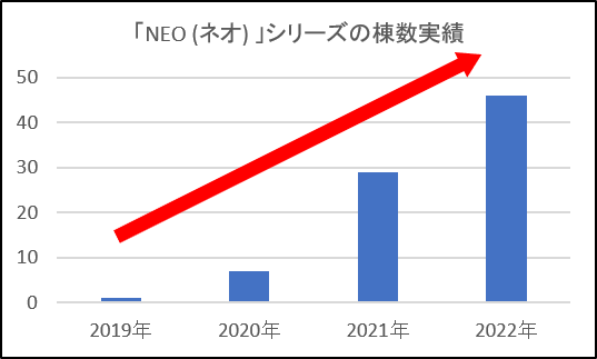 2019年4月から販売を開始した「NEO」シリーズは、規格性と自由性が高く、建物の構造のバリエーションが豊富です。システム建築では平屋が一般的ですが、「NEO」は平屋だけでなく2階建ての建設も可能となっており、さらに床荷重も1平方メートル当たり1.5トンまで対応できるため、2階に重量物を置く倉庫や工場にも導入しやすくなっています。2021年4月には、より空間の広がりと設計自由度が高い「NEO-Grid」を発売し、設備のレイアウトが複雑な工場や店舗などにも導入拡大につなげています。特に「NEO」シリーズは、工期短縮ではシステム建築での対応範囲(基礎・鉄骨・屋根・外装)で約25%の工期短縮可能となっており、棟数実績が前年比159%と順調に推移しています。 当社は建築主のあらゆる要望に応えるべく、今後も製品開発に積極的に取り組んでまいります。