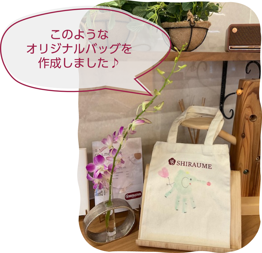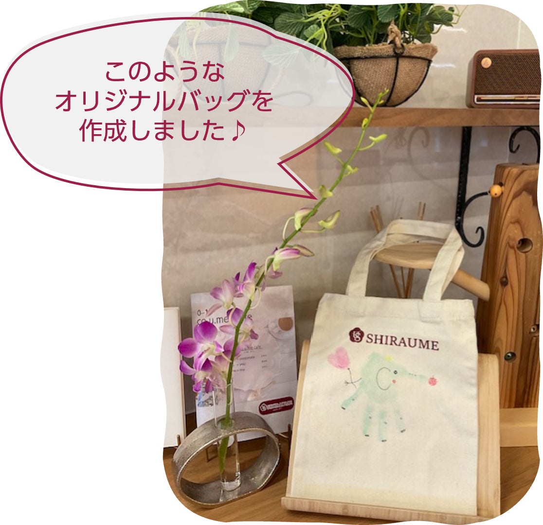 8月3日(木)には「オリジナルバッグ作り」を開催し、トートバッグに子どもの手形スタンプをして世界に1つだけのバッグを、親子で一緒に楽しく作りました。子どもの手が絵の具に触れる不思議な感触や感覚を味わったり、バッグに色がつく様子を楽しんだりする機会となりました。