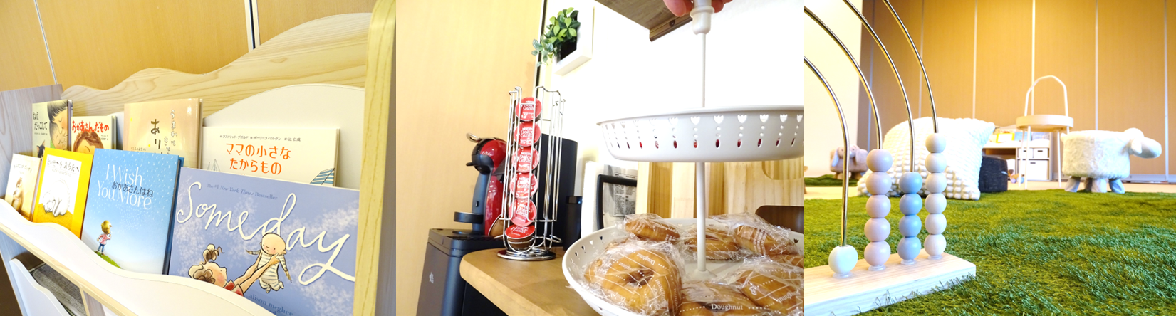 co.u.me cafeは、“子育てを楽しむママに寄り添うための場でありたい”という白梅幼稚園の想いを込めて名づけました。0~1歳児のお子様とお母様を応援するためのカフェ風空間です。